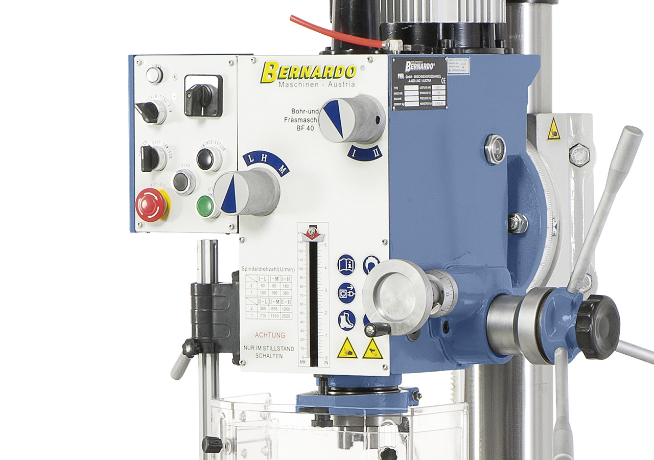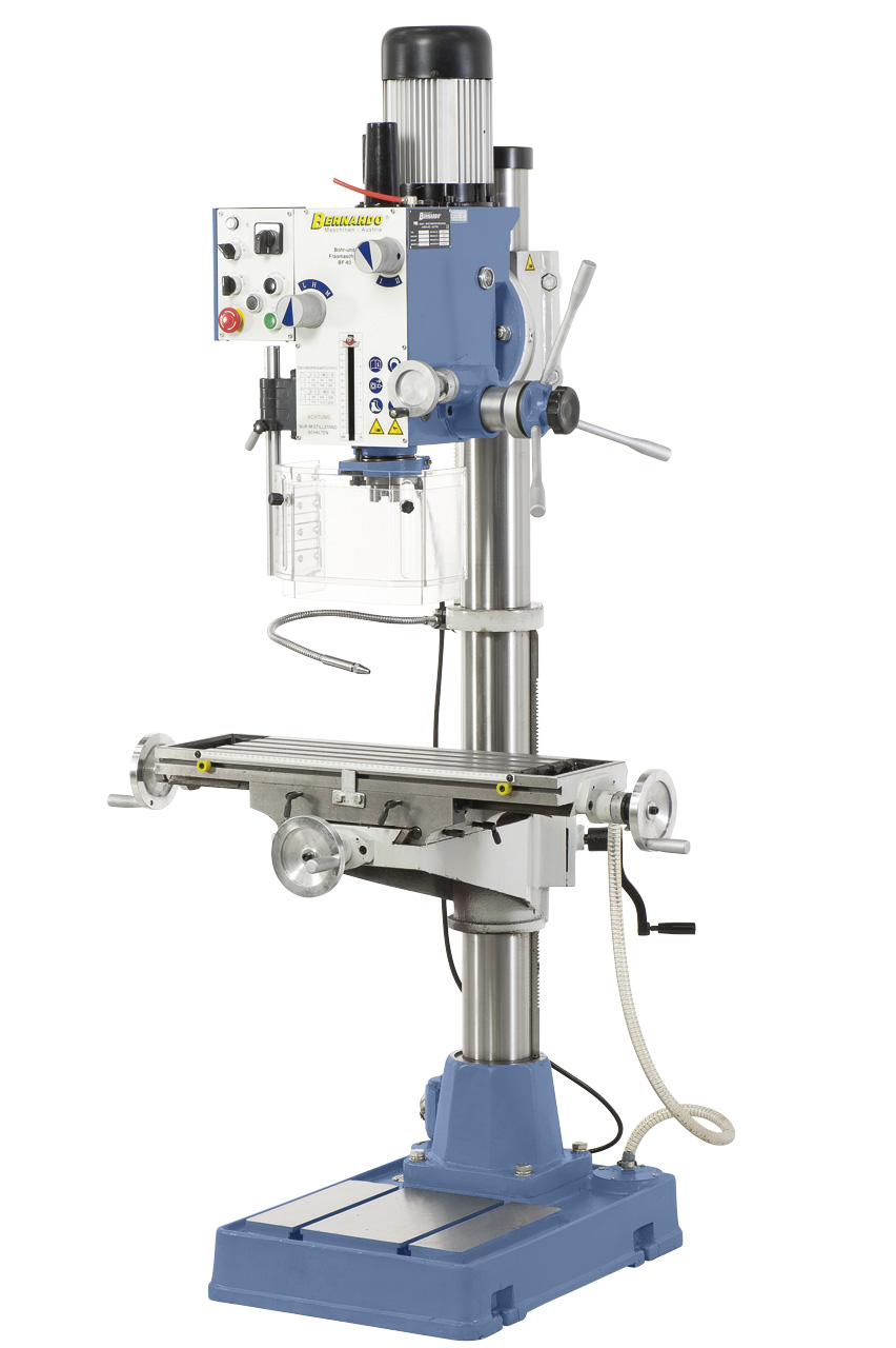 Die präzise Bohr- und Fräsmaschine BF 40 ist für Bohr-, Fräs- und Senkarbeiten bestens geeignet. Durch den dreh- und schwenkbaren Getriebekopf ist diese Maschine vielseitig einsetzbar in Reparaturbetrieben, mechanischen Werkstätten sowie im Ausbildungsbereich.