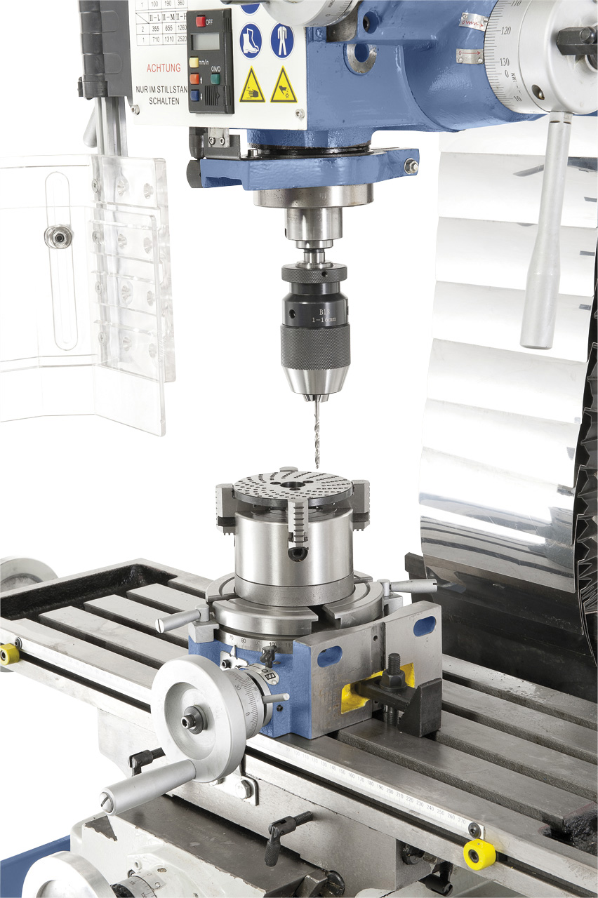 - 3-Achs-Digitalanzeige i200 mit LCD-Display - Automatischer Pinolenvorschub - Anzugsspindel M 10 mit Adapter M 16 - Reduzierhülse MK 4/3, MK 3/2 - Zahnkranzbohrfutter 1 - 16 mm mit Aufnahme MK 4 - Digitale Pinolenhubanzeige - Messerkopffräser 80 mm mit Aufnahme MK 4 - Höhenverstellbare Schutzabdeckung - Lamellen-Schutzabdeckung - Gewindeschneideinrichtung - Längsmeßskala - Bedienwerkzeug