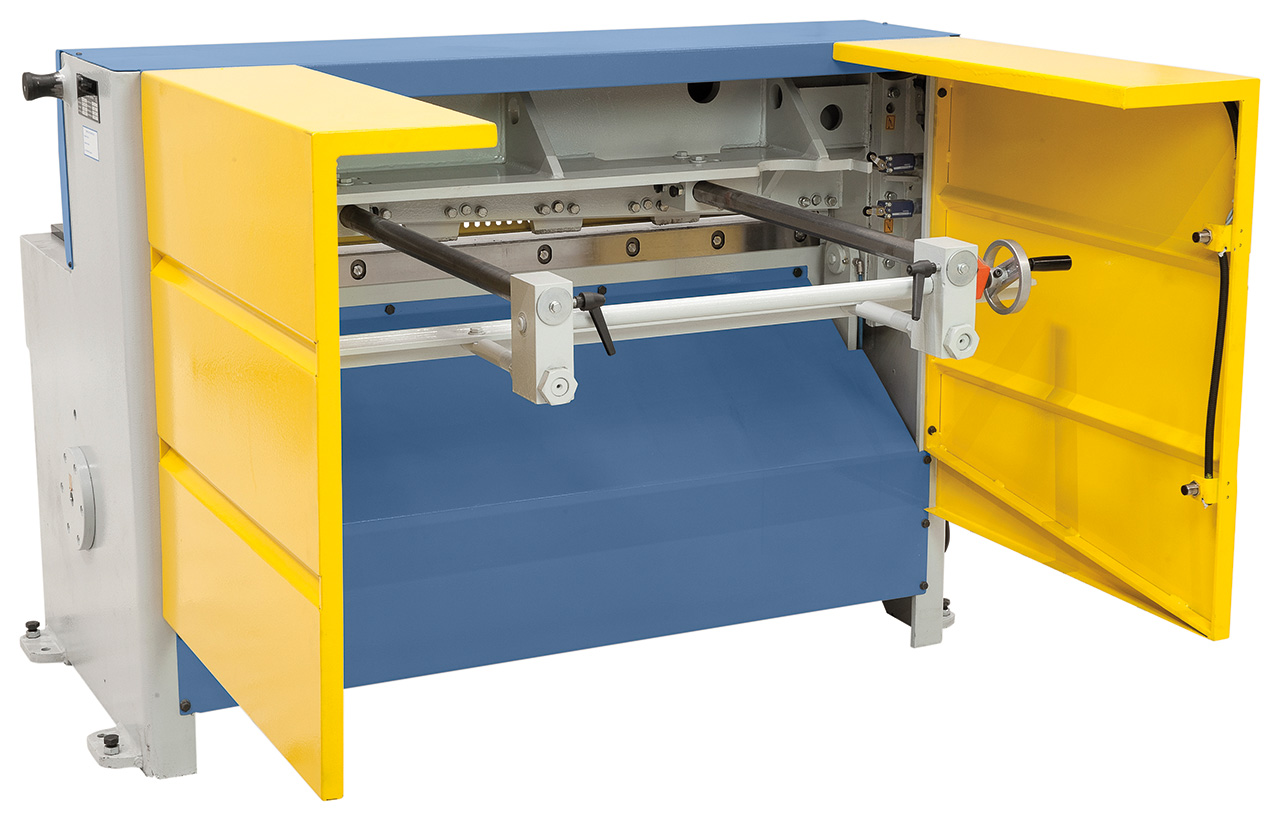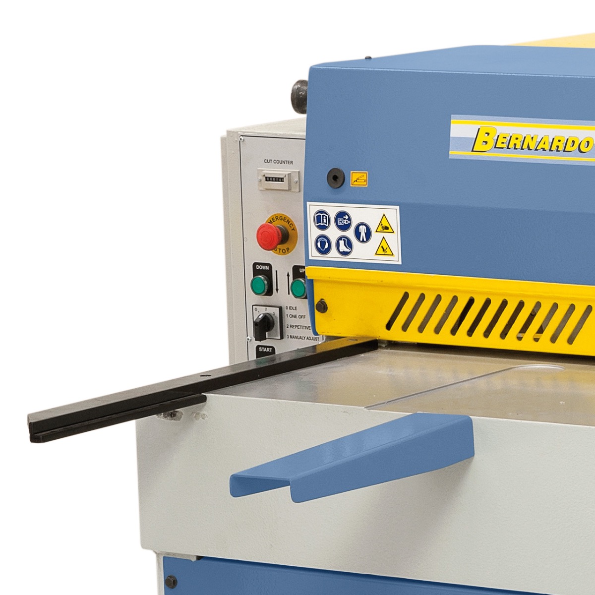 Scherentisch mit rechtwinkeligem Anschlag für exaktes Einstellen des Werkstückes