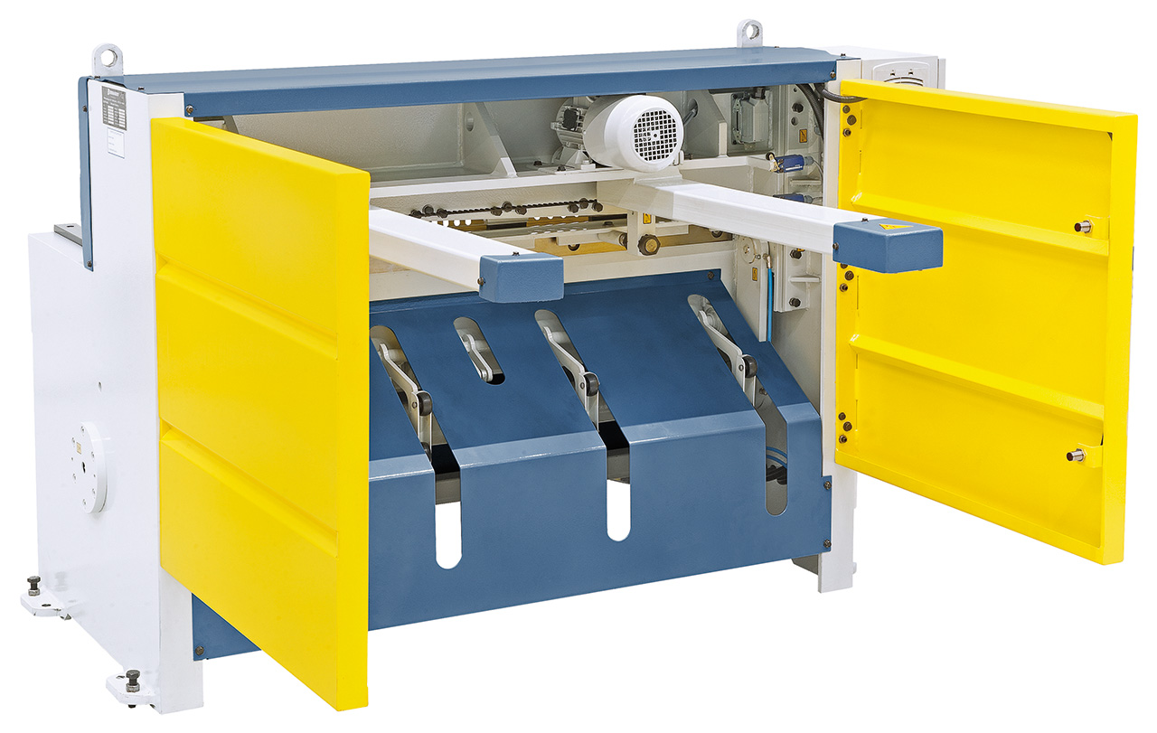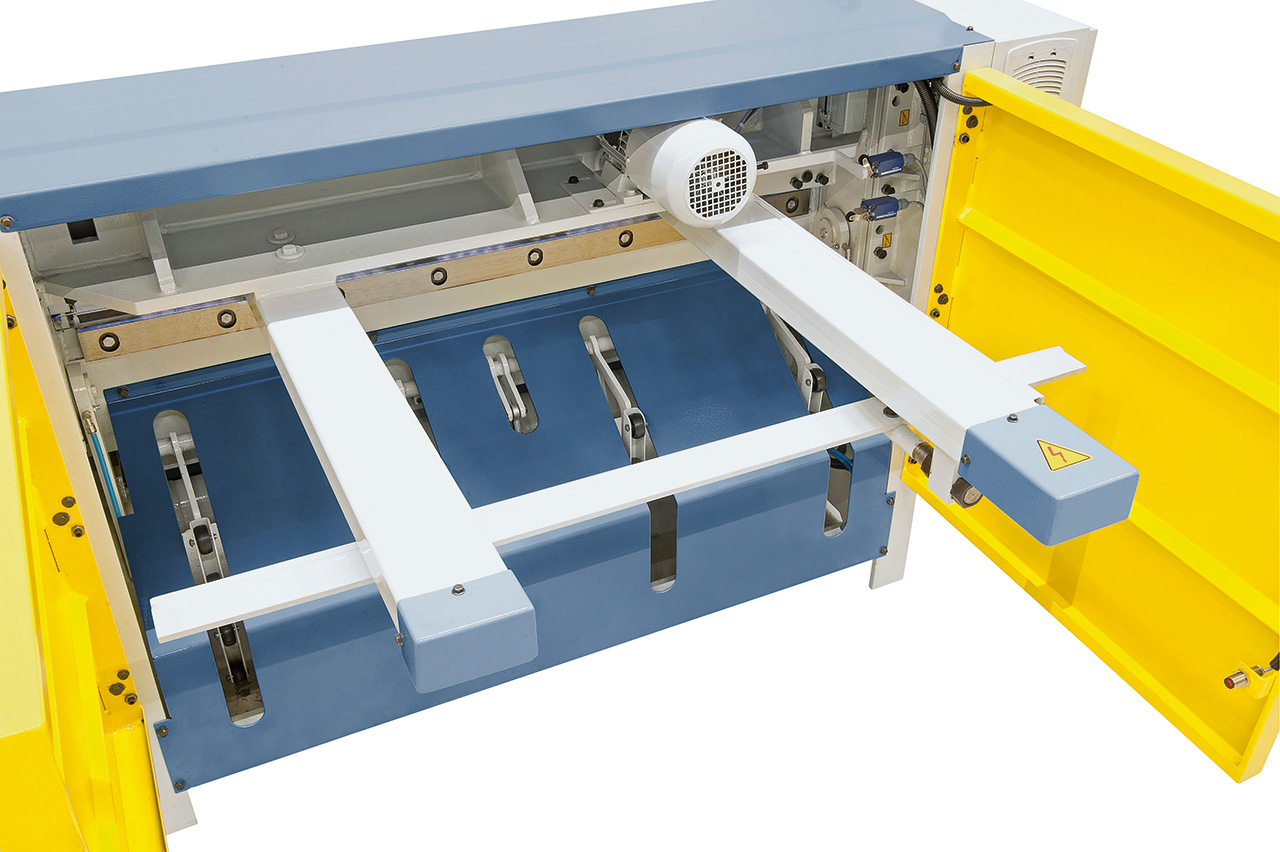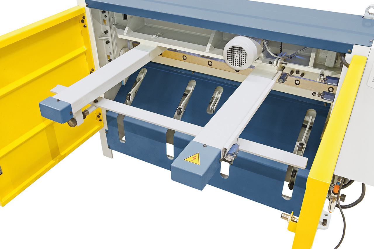 Rückwertige Maschinenansicht mit Schutzblech und Fotozellen.