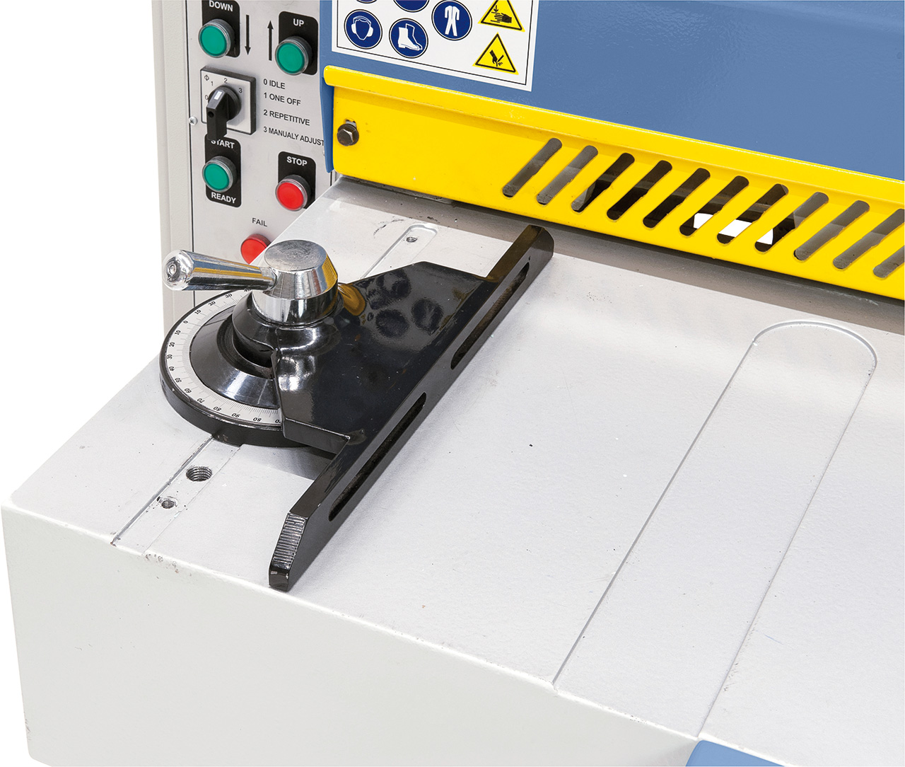 Scherentisch mit rechtwinkeligem Anschlag für exaktes Einstellen des Werkstückes