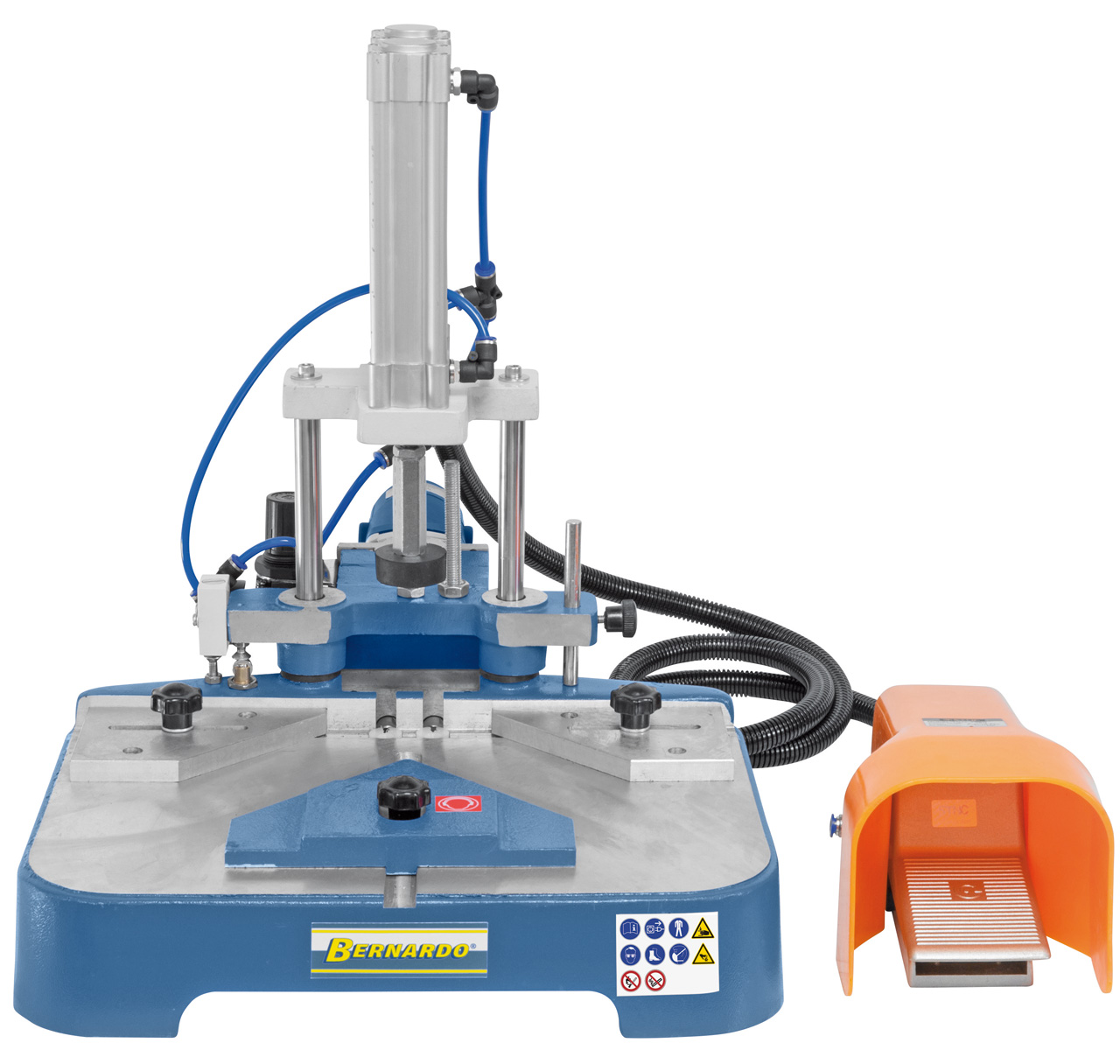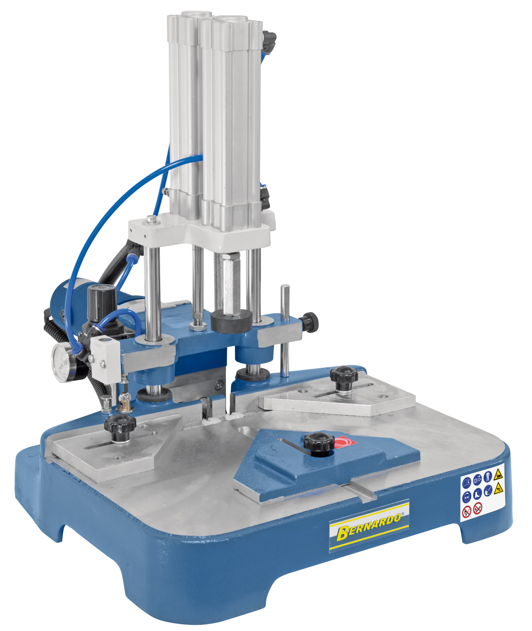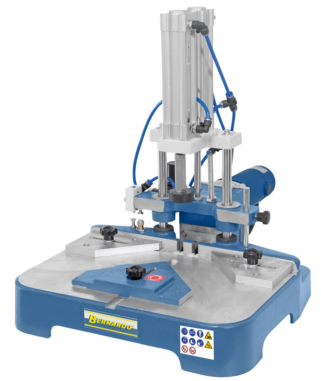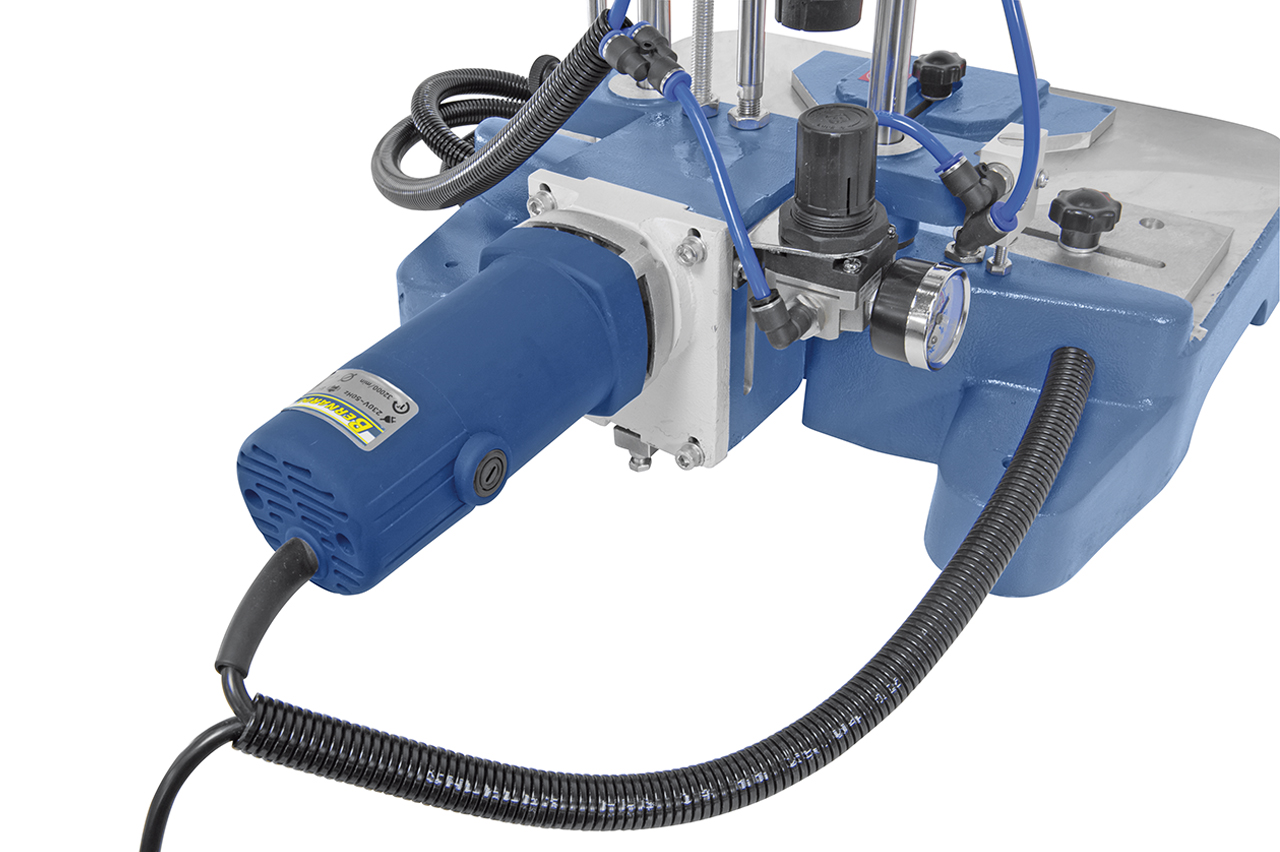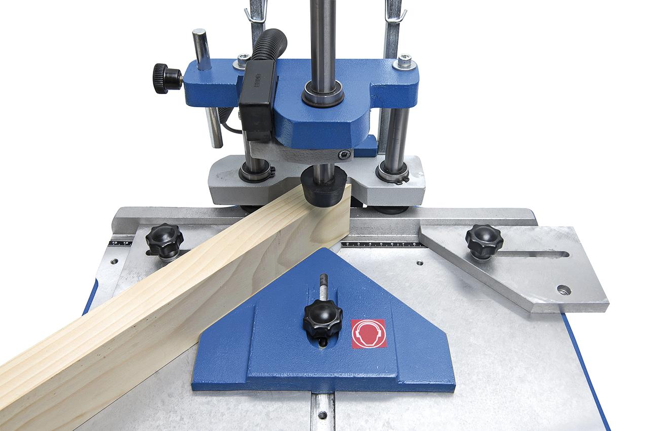 Funktionsweise: Beim Herunterdrücken des Hebels wird das Werkstück geklemmt und die Fräser verfahren bis zur voreingestellten Frästiefe. Beim Hochheben des Hebels in die Ausgangsposition wird das gefräste Werkstück freigegeben und der Motor schaltet automatisch ab