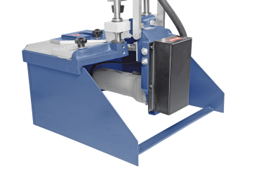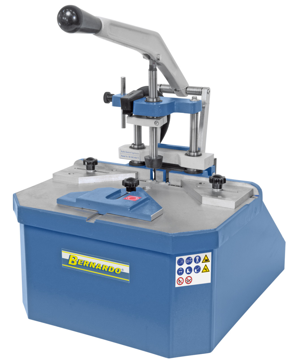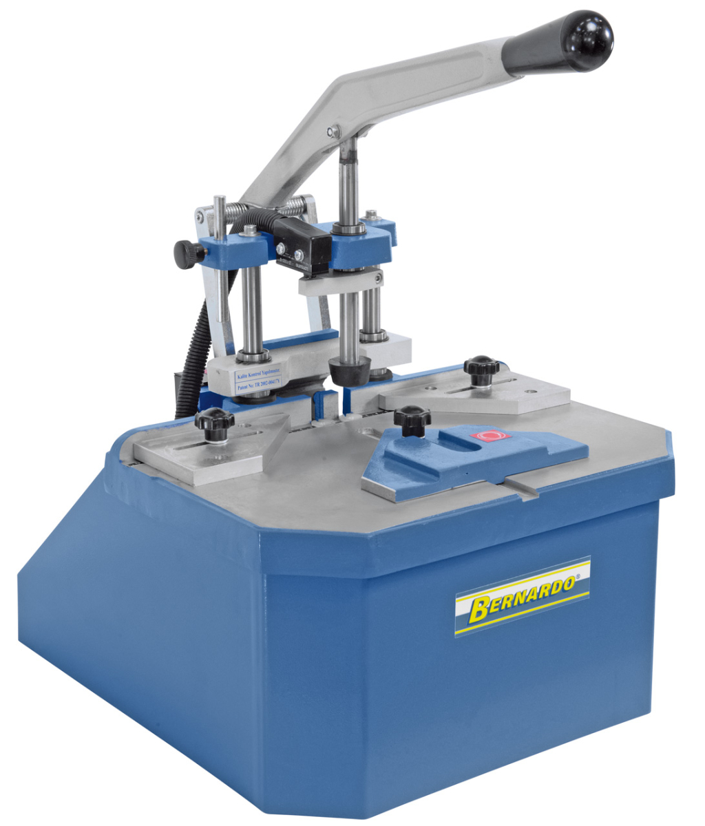Funktionsweise: Beim Herunterdrücken des Hebels wird das Werkstück geklemmt und die Fräser verfahren bis zur voreingestellten Frästiefe. Beim Hochheben des Hebels in die Ausgangsposition wird das gefräste Werkstück freigegeben und der Motor schaltet automatisch ab