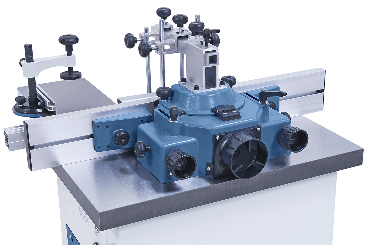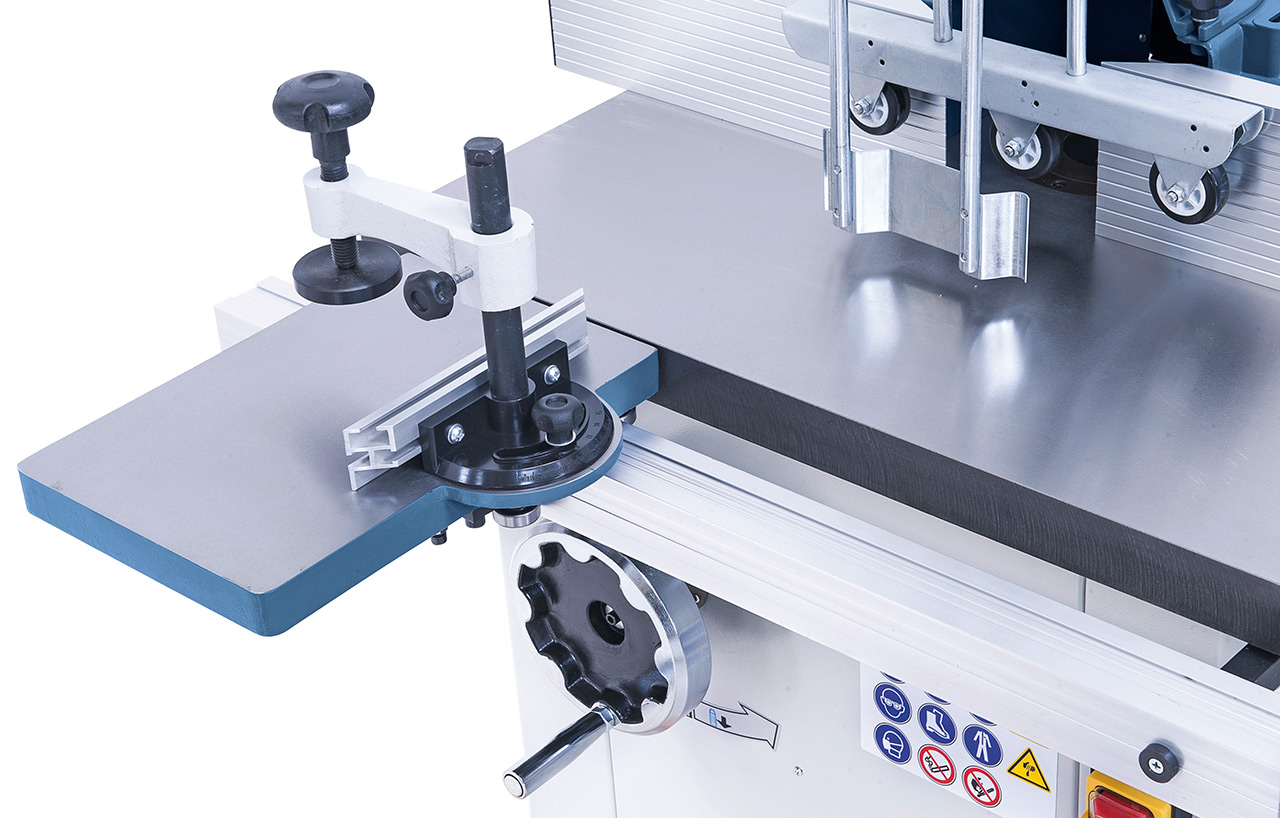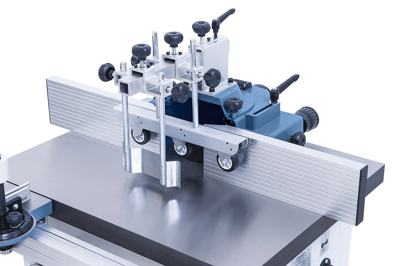Die Fräserschutzhaube ist mit eloxierten Aluminium-Anschlagschienen ausgestattet.