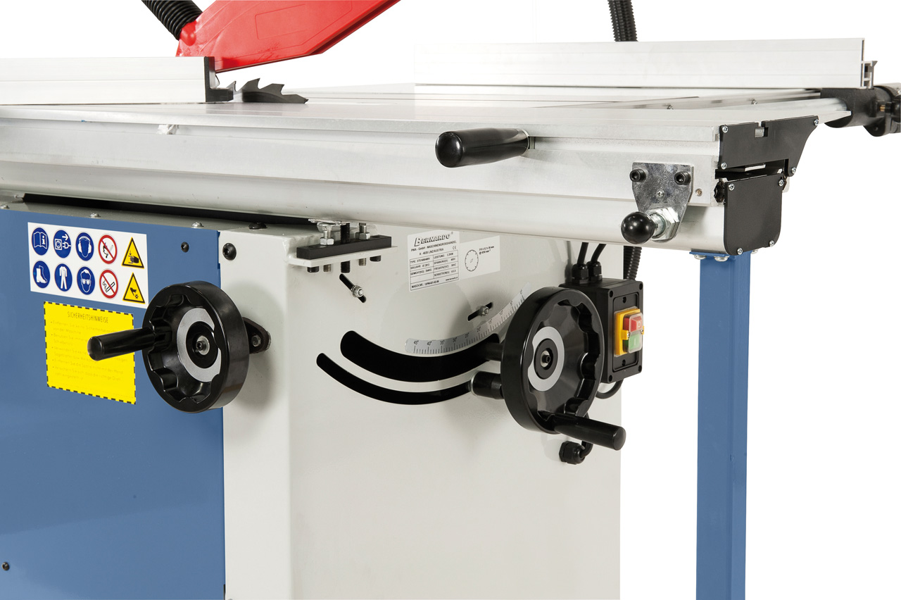 Die Höhenverstellung bzw. Schwenkung des Sägeaggregates erfolgt mittels ergonomisch angebrachten Handräder.