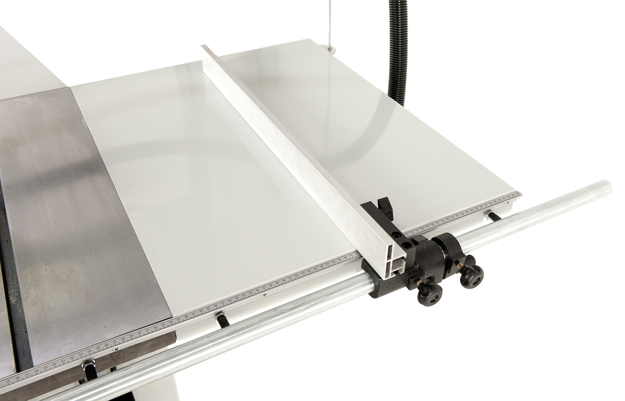 Der leichtgängige Auslegertisch ist zusätzlich mit einem Schwenkarm ausgestattet, wodurch das Bearbeiten von großen Platten ermöglicht wird.
