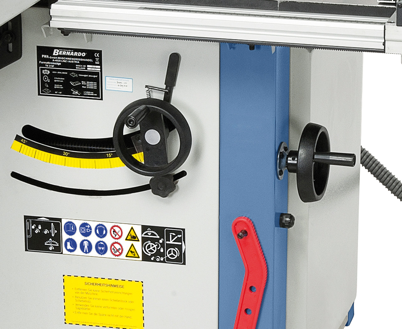 Die Verstellung des Sägeaggregates erfolgt durch ergonomisch angebrachte Handräder am Maschinenkörper