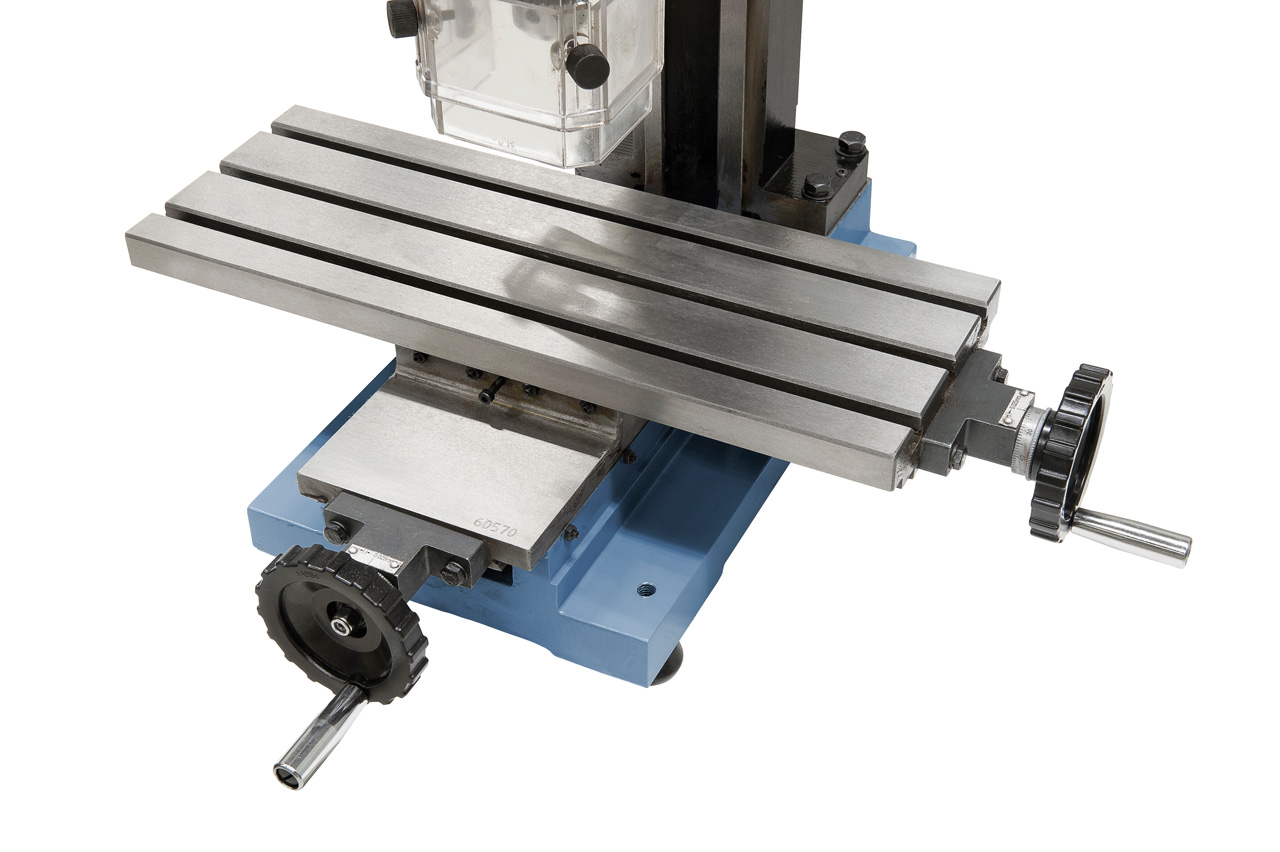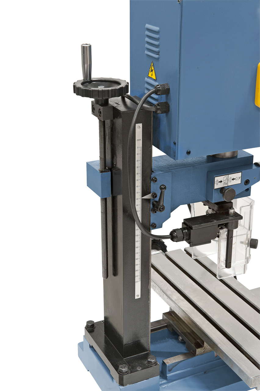 Pinolenzustellung wahl- weise über Handgriff oder Feinzustellung mittels Handrad.