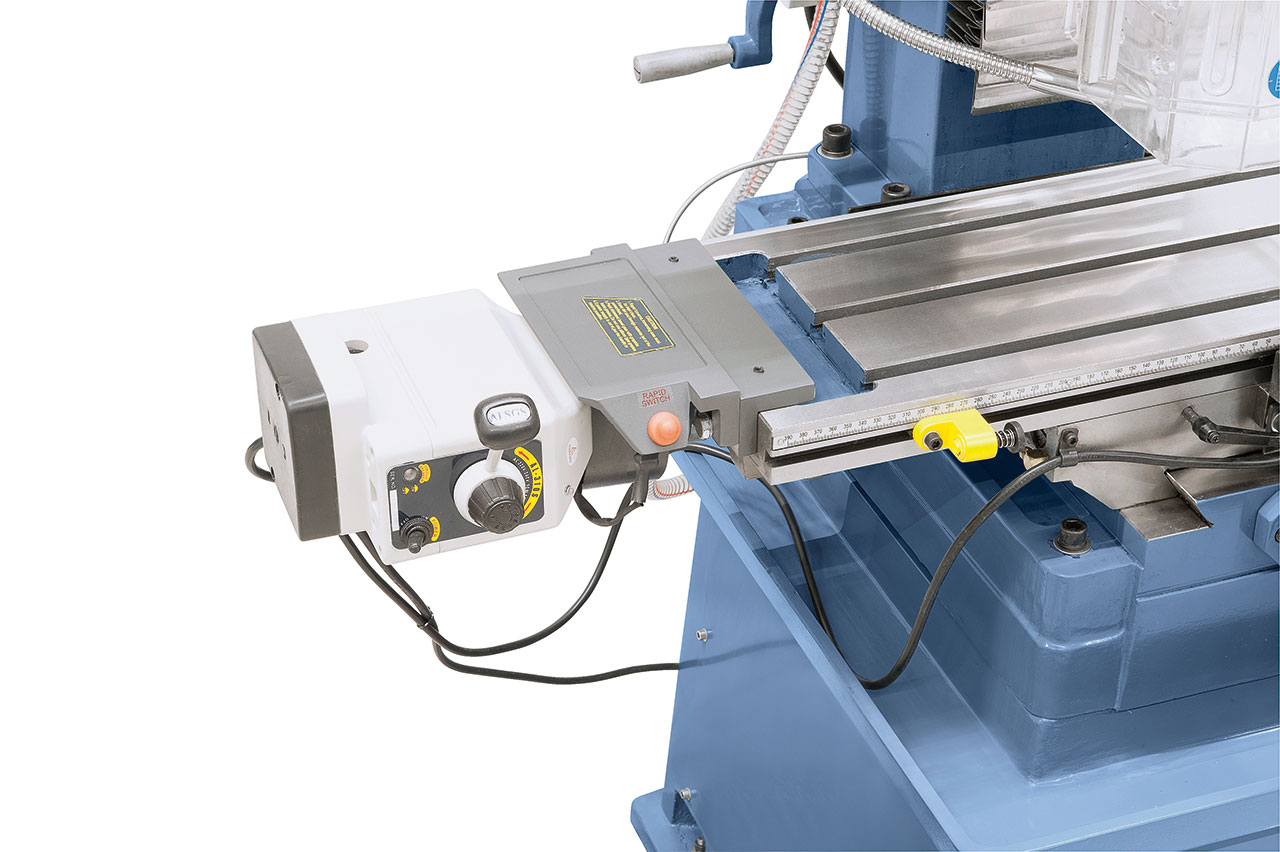 Beschreibung:Die Bohr- und Fräsmaschine FM 55 HSV Vario zeichnet sich neben der motorischen Höhenverstellung des Fräskopfes und dem automatischen Pinolenvorschub vor allem durch die stufenlose Drehzahl aus. Schon die Grundausstattung beinhaltet alle wichtigen Zubehöre (3-Achs-Digitalanzeige, Frästischvorschub, Zentralschmierung, Kühlmitteleinrichtung, LED-Arbeitsleuchte, Graugussuntergestell mit Kühlmittelrinne, Sicherheitseinrichtungen nach CE-Norm, …), wodurch diese Maschine universell einsetzbar ist. Features: