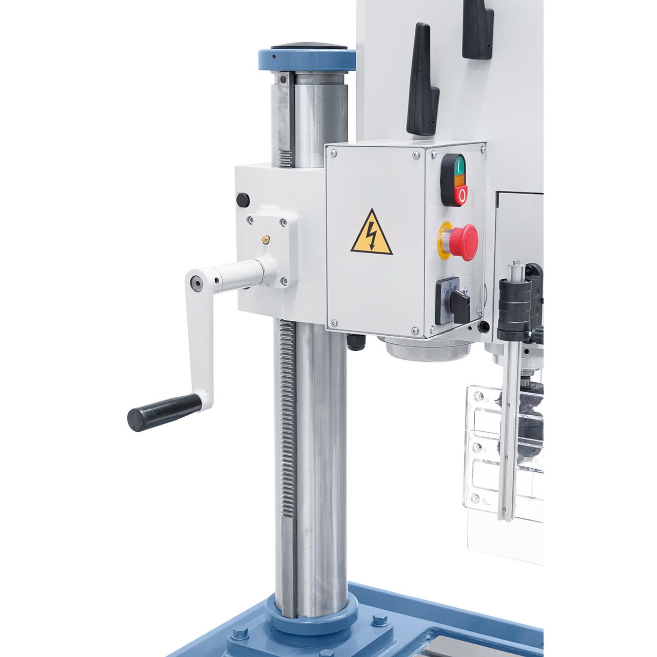 Einfache Höhenverstellung des Bohrkopfes mittels Kurbel.