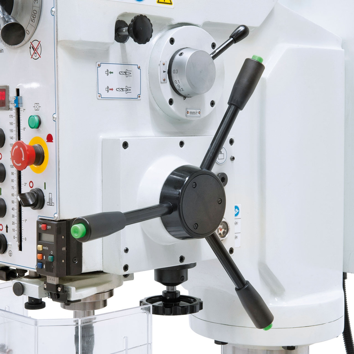 Massiver Getriebekopf mit ergonomisch angebrachten Schalt- und Bedienelementen. Digitalanzeigen für Bohrtiefeneinstellung und Drehzahl sind serienmäßig enthalten.