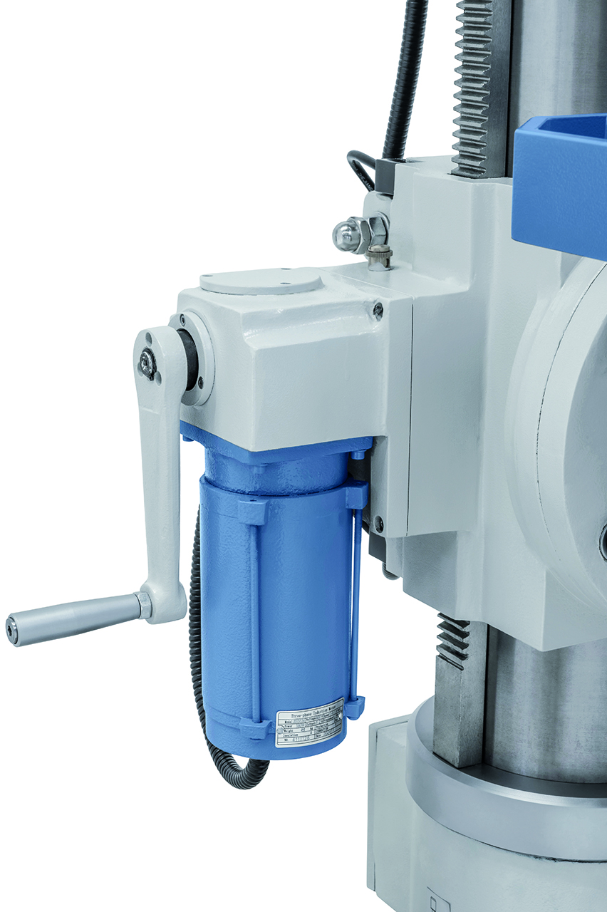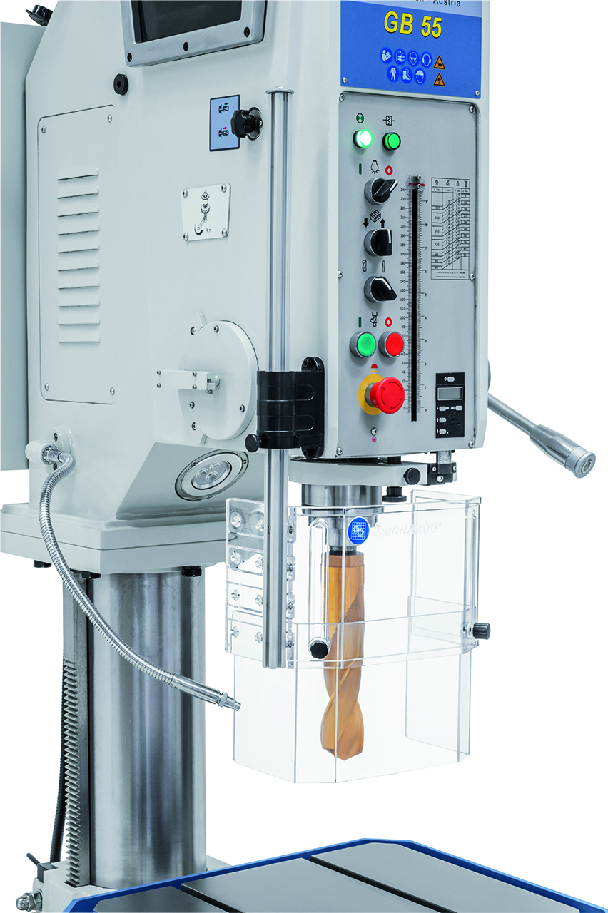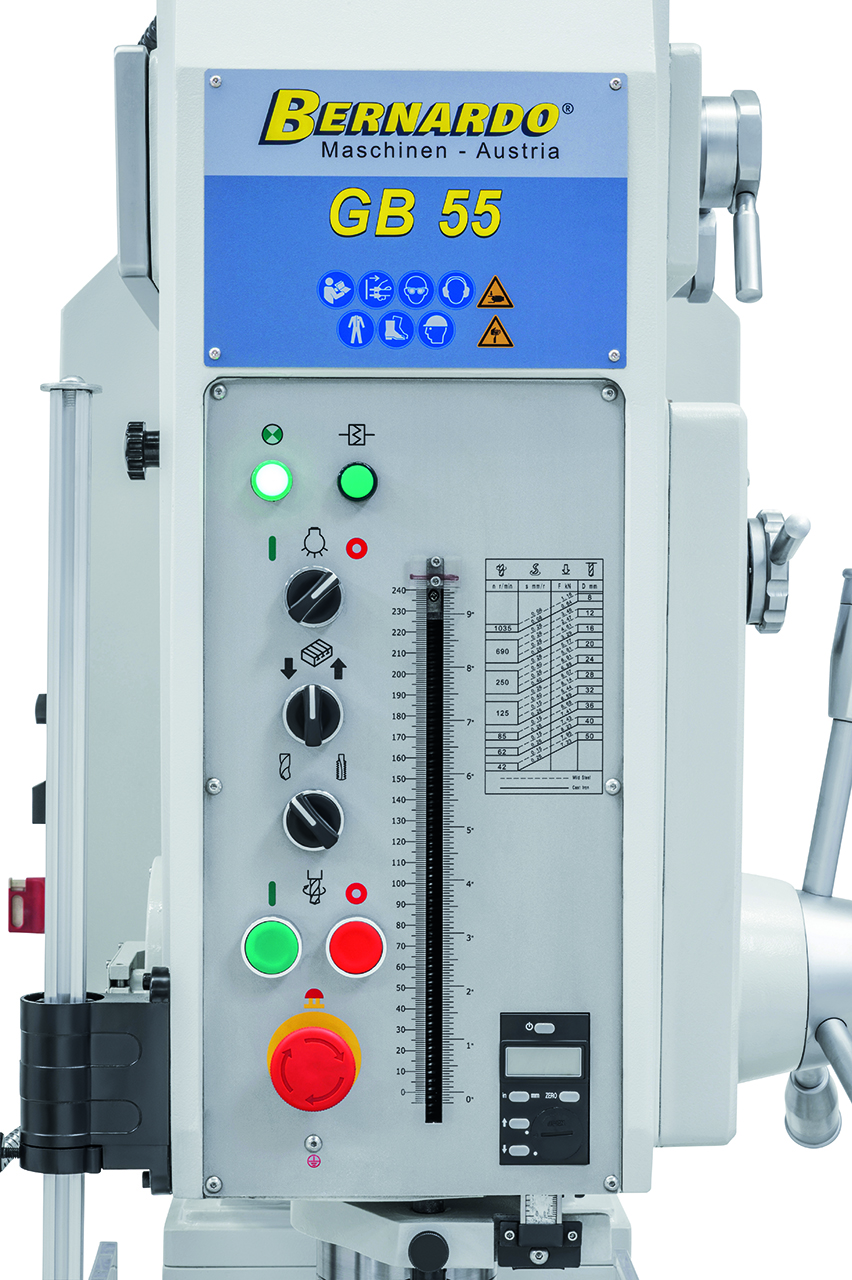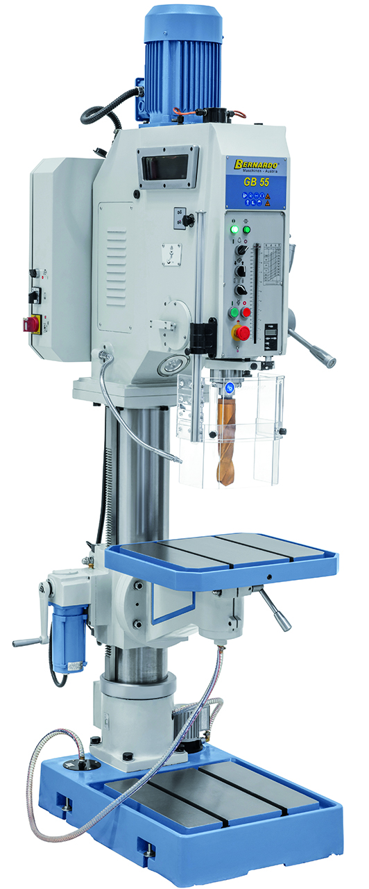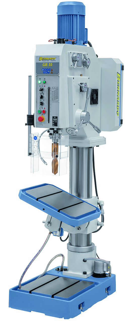 Die Getriebebohrmaschine GB 55 ist serienmäßig mit einem motorischen Tischhub zur Reduzierung der Nebenzeiten ausgestattet. Durch die robuste Ausführung und der großen Leistungsfähigkeit ist dieses Modell sowohl für Reparaturbetriebe als auch für die industrielle Fertigung verwendbar.