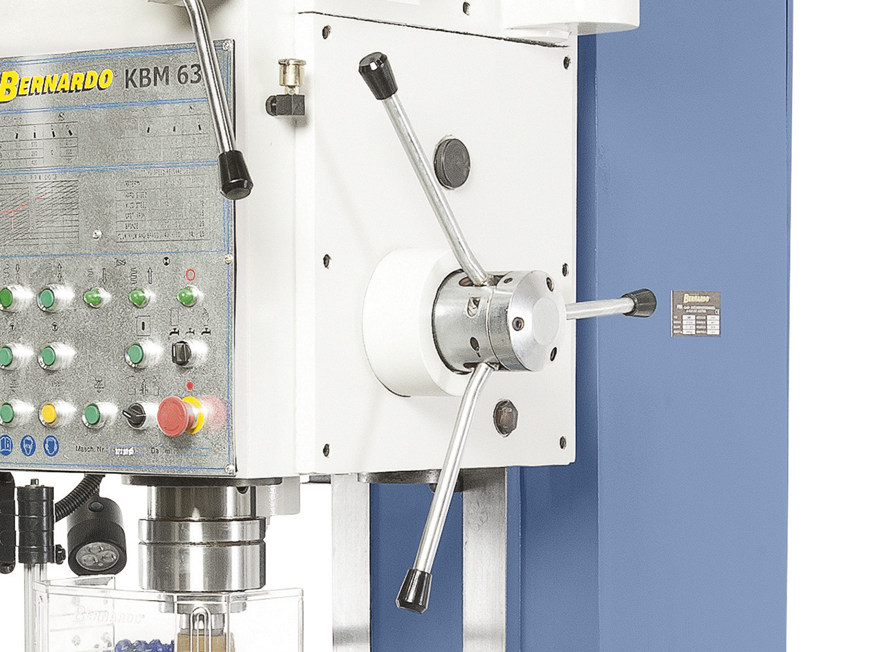 Sterngriff für manuelle Pinolenzustellung, Kupplungshebel für automatischen Vorschub. Übersichtlich aufgebauter Bohrkopf mit sämtlichen Schalt- und Bedienelementen.