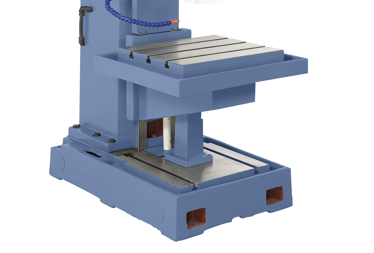 Massive, großdimensionierte Bodenplatte mit T-Nuten, Arbeitstisch kann demontiert werden, optimal zum Bearbeiten von hohen Werkstücken