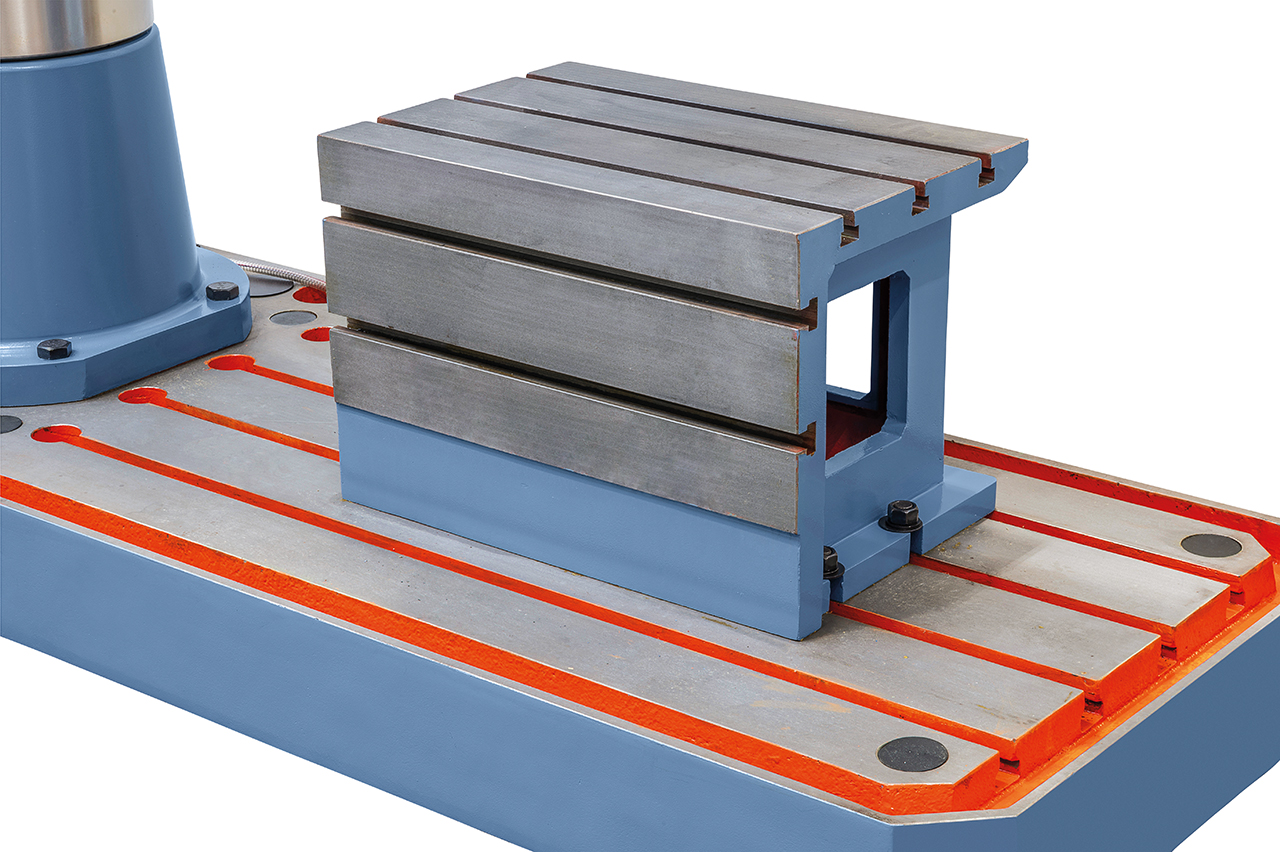 Præcisionsslebet kubebord med 5 T-notgange, inkluderet som standard i leveringsomfanget.