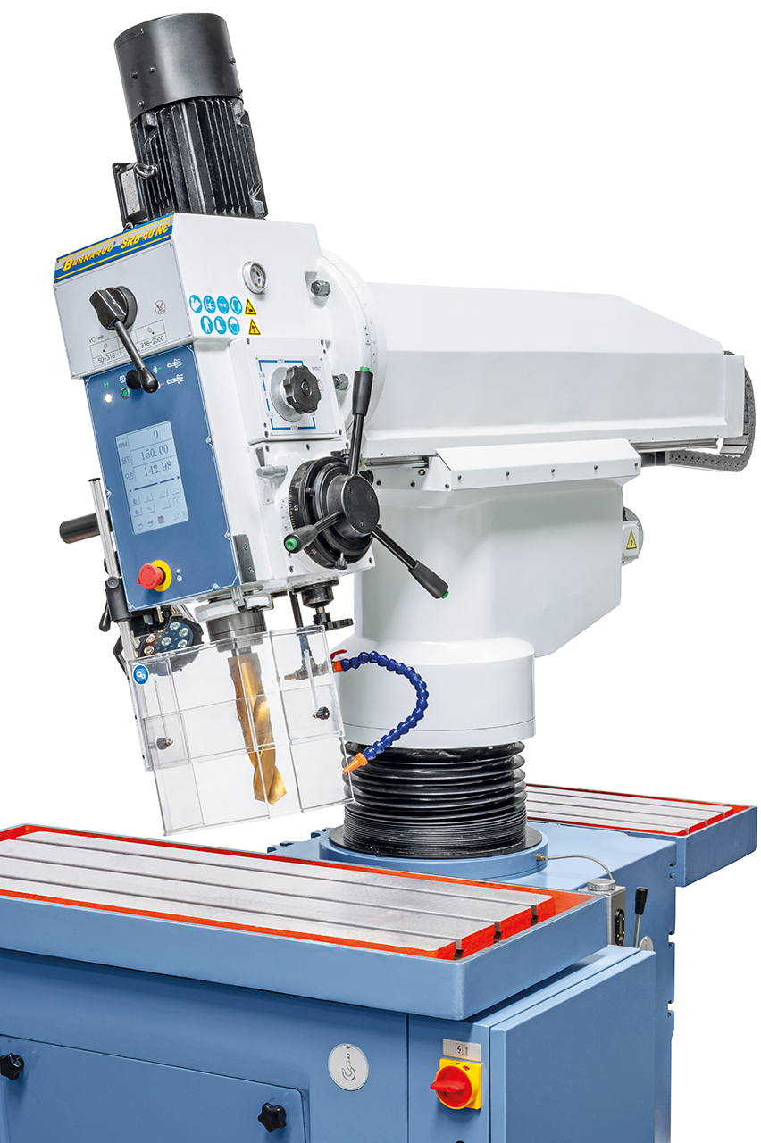 Elektromotorische Höhenverstellung des Bohrkopfes ohne Verstellung der Bohrposition, ideal zum Tieflochbohren