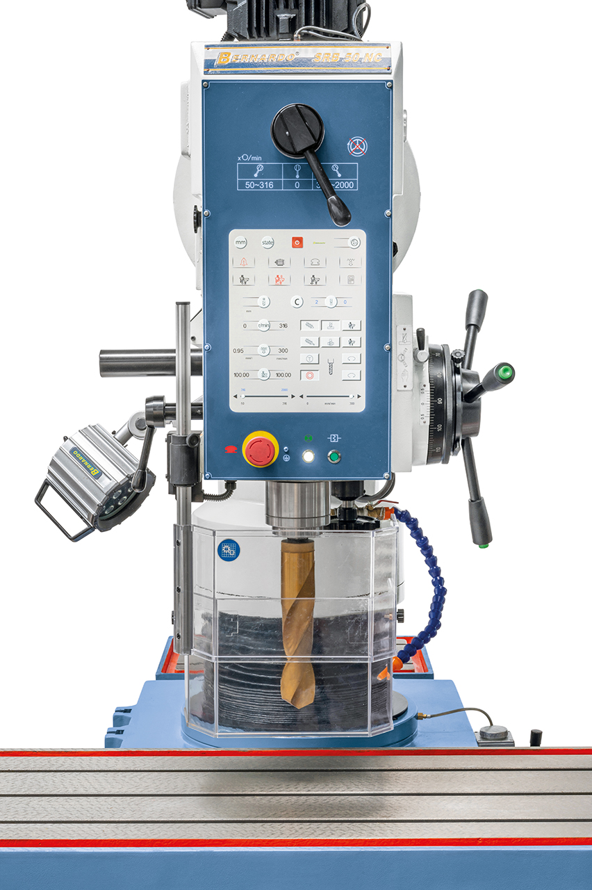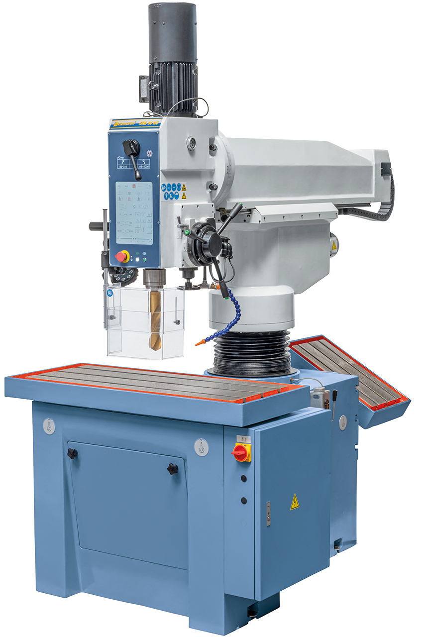 Die serienmäßige Steuerung Bohrtronic errechnet nach Eingabe des Werkzeugdurchmessers und des Materials (Guss / Stahl) die ideale Drehzahl bzw. Vorschubgeschwindigkeit beim Bohren und Gewindeschneiden