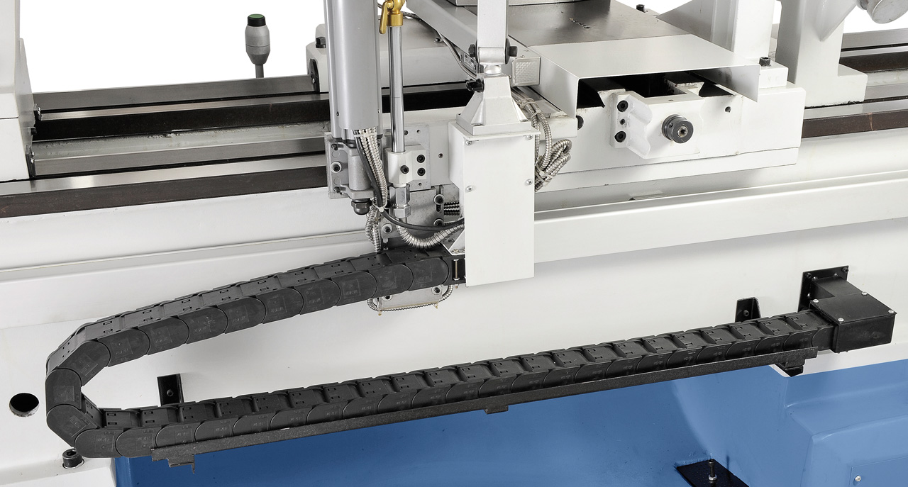 Stufenlose Drehzahlregelung am Getriebekopf, dadurch kann die Schnittgeschwindigkeit optimal an das Werkstück und die Vorschubgeschwindigkeit angepasst werden