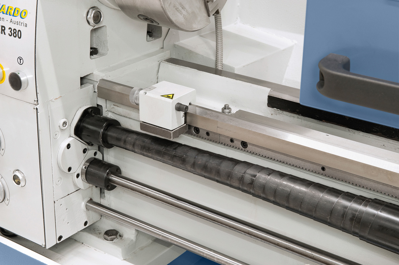 Leichtgängige Vorschub- und Drehzahlregelung am Getriebekopf, ruhiger Lauf durch gehärtete und geschliffene Zahnräder, im Ölbad laufend.