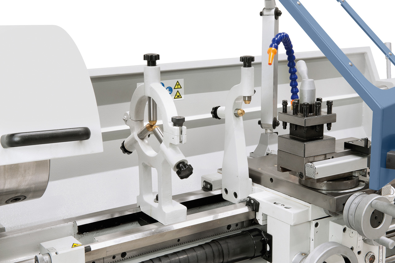 Zum Stabilisieren von langen Werkstücken serienmäßig mit einer feststehenden bzw. mitlaufenden Lünette ausgestattet.