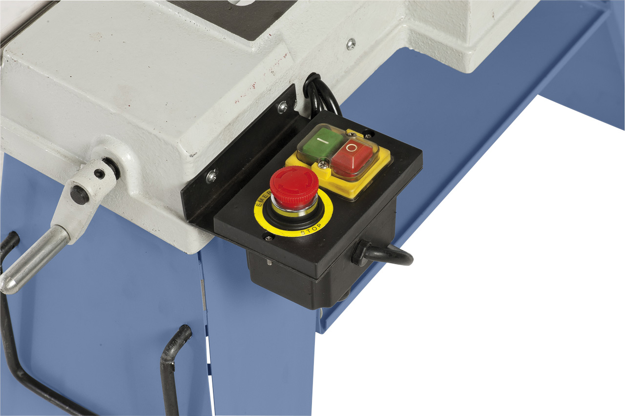 Sicherheitsschalter mit Unterspannungsauslöser und separatem Not-Halt-Taster, automatische Endabschaltung nach Beendigung des Sägevorganges