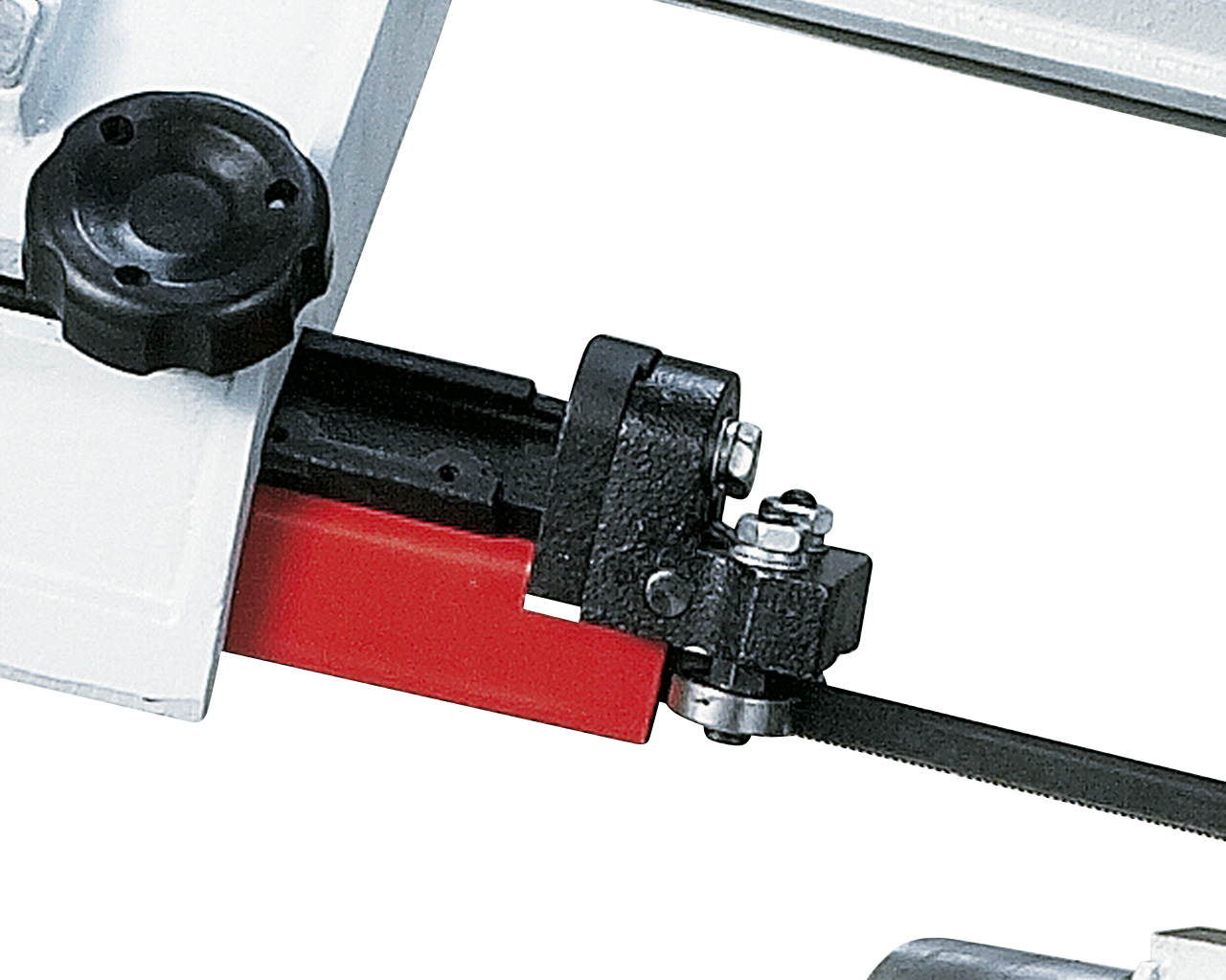 Kugelgelagerte Sägebandführung, einstellbar auf die jeweilige Werkstückbreite.