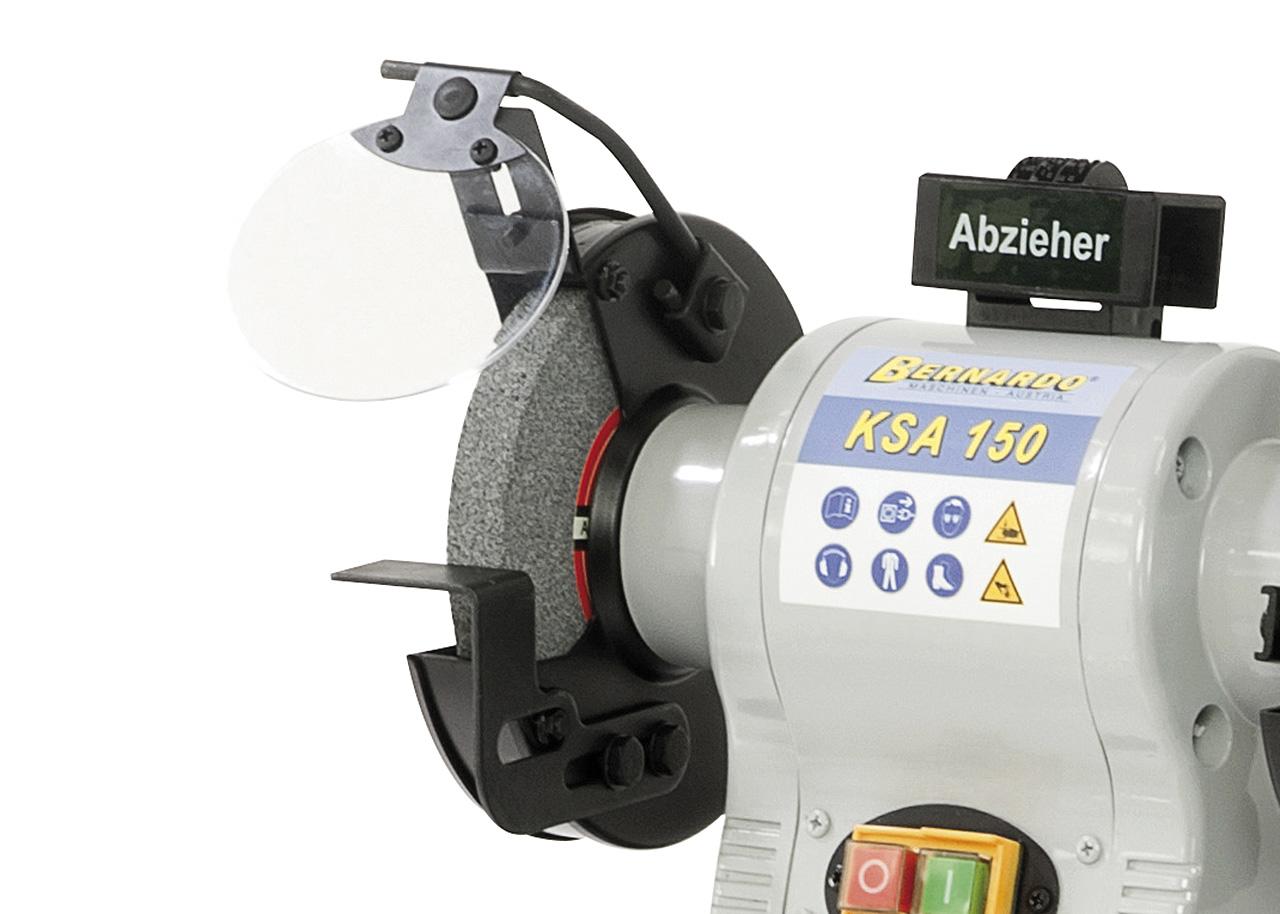 Serienmäßig mit Schruppscheibe, verstellbarer Werkstückauflage, seitlich geschlossener Schutzhaube und Augenschutz