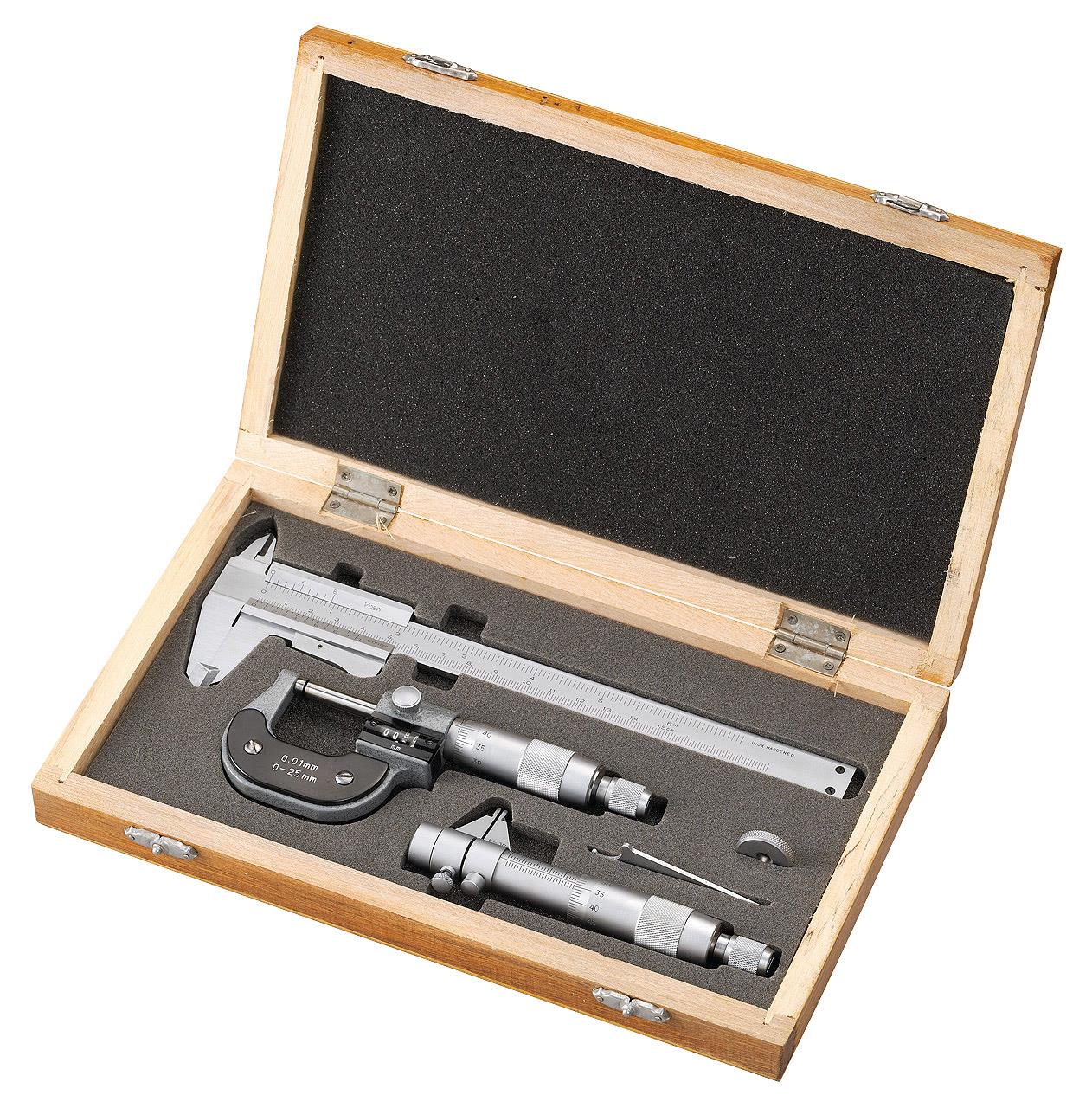 Schiebelehre, Mikrometer und Innenmessschraube in Holzkassette