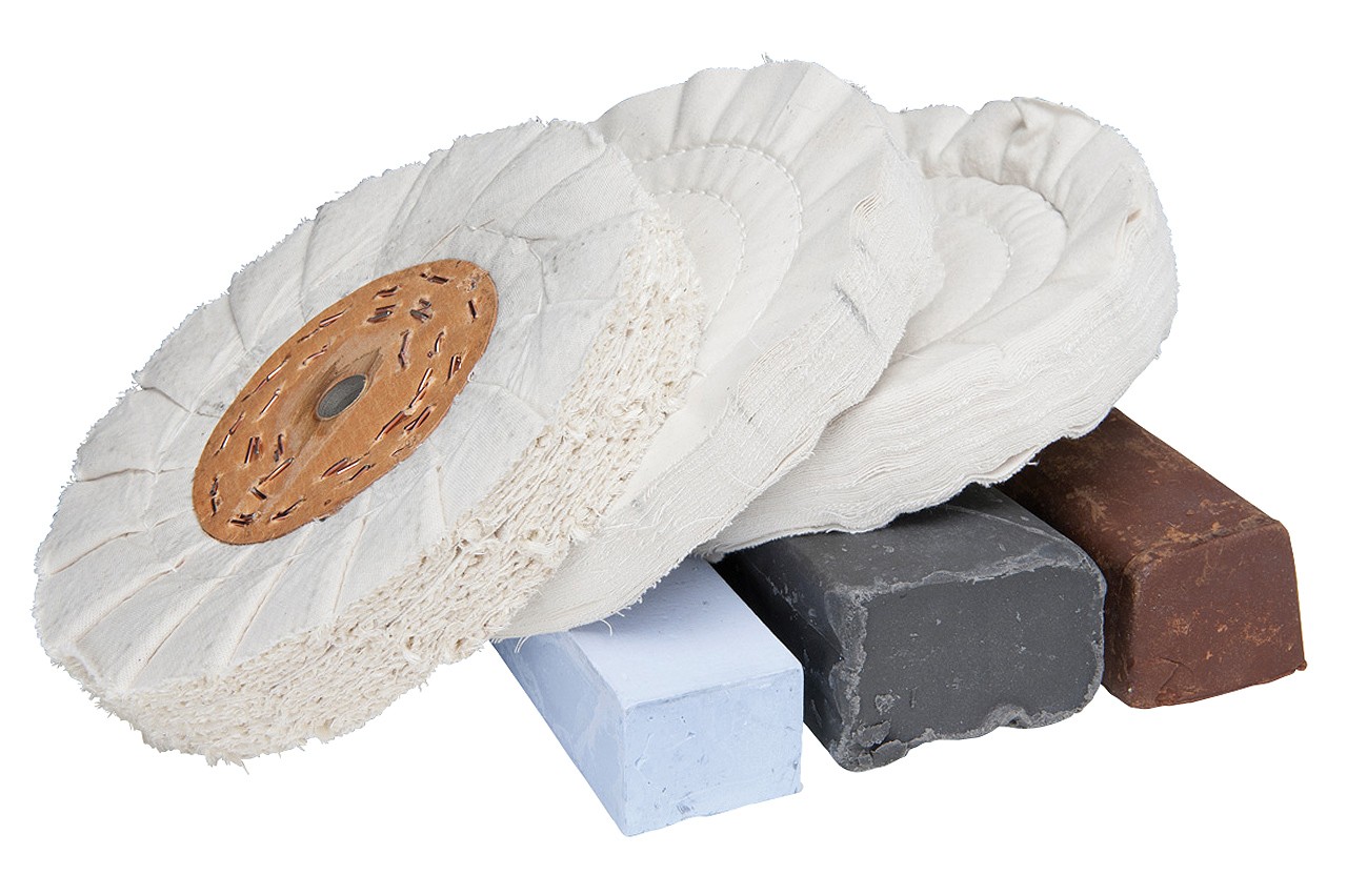 Technische Spezifikation: Set bestehend aus: Vorpolierpaste Abra 153 (schwarz) Scharfe Mattierungspaste mit groben Korn zum aggressiven Vorpolieren von Stahl und Edelstahl, Paste ist auch hervorragend geeignet zum Mattieren und Vorpolieren von Aluminium. Farbe: schwarz Schärfe / Abrieb: 10 (10 = scharf, 1 = mild) Fettgehalt: trocken Gewicht: ca. 1000 g Polierpaste Rekord 845 (braun) Klassische Polierpaste mit etwas gröberem Korn, mittelfettig und zügig, schafft perfekte NE-Metalloberfl ächen (wie z.B.: Aluminium, Kupfer, Messing, Magnesium, Zink, usw.). Die perfekte Paste zum Polieren von Alufelgen. Farbe: braun Schärfe / Abrieb: 5 (10 = scharf, 1 = mild) Fettgehalt: mittel Gewicht: ca. 800 g Abklärpaste Lumo 934 (blau) Der „Klassiker', besondere Inhaltsstoffe bringen sehr gute Löslichkeit der Fette um vorpolierte Teile auf Hochglanz zu bringen. Optimal geeignet für Edelstahl, Aluminium, Kupfer und Messing. Farbe: blau Schärfe / Abrieb: 2 (10 = scharf, 1 = mild) Fettgehalt: trocken Gewicht: ca. 700 g Sisal-Nessel-Polierscheibe 250 x 25 x 20 mm Eine harte Polierscheibe, die ideal zum Vorpolieren ist und um raue Oberflächen und zerkratzte Werkstücke zu bearbeiten. Nessel-Polierscheibe gesteppt 250 x 25 x 20 mm Eignet sich bestens zum Polieren von Edelstahl, Stahl, Aluminium und Messing. Top Qualität aus deutscher Produktion garantiert eine lange Standzeit. Molton-Polierscheibe gesteppt 250 x 25 x 20 mm Weiche Schwabbelscheibe für stationäre Maschinen zum Abklären (Hochglanzpolieren) von Edelstahl, Stahl, Aluminium, NE-Materialien, Kunststoffen und Holz. Produktbilder: (Abbildungen zeigen ggf. Zubehör und Sonderausstattung. Bei Unklarheiten helfen wir Ihnen gerne weiter.)