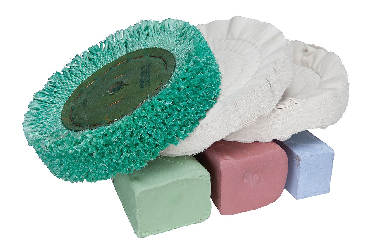 05-2011 Bernardo Poliersets Polierset für Edelstahl 250 x 25 x 20 mm, 6-tlg. Features:Set bestehend aus: Vorpolierpaste Kiesolin 410 (grün) Glanzgebendes Korn, sehr gute Haftung an Sisalscheiben, hervorragend geeignet zum Vorpolieren von Edelstahl und Stahl Farbe: grün Schärfe / Abrieb: 6 (10 = scharf, 1 = mild) Fettgehalt: fett Gewicht: ca.1100 g Polierpaste Kiesolin 358 (rot) Klassische Universalpaste mit mittleren Korn geeignet für alle Metalle Farbe: rot Schärfe / Abrieb: 4 (10 = scharf, 1 = mild) Fettgehalt: mittel Gewicht: ca. 1000 g Abklärpaste Lumo 934 (blau) Der „Klassiker', besondere Inhaltsstoffe bringen sehr gute Löslichkeit der Fette um vorpolierte Teile auf Hochglanz zu bringen. Optimal geeignet für Edelstahl, Aluminium, Kupfer und Messing. Farbe: blau Schärfe / Abrieb: 2 (10 = scharf, 1 = mild) Fettgehalt: trocken Gewicht: ca. 700 g Sisal-Kordel grün 250 x 25 x 20 mm Zum Vorpolieren von Edelstahl, durch die hohe Eintauchtiefe ideal bei Winkel, Ecken, geriffelten Platten und speziellen Formteilen. Nessel-Polierscheibe gesteppt 250 x 25 x 20 mm Eignet sich bestens zum Polieren von Edelstahl, Stahl, Aluminium und Messing. Top Qualität aus deutscher Produktion garantiert eine lange Standzeit. Molton-Polierscheibe gesteppt 250 x 25 x 20 mm Weiche Schwabbelscheibe für stationäre Maschinen zum Abklären (Hochglanzpolieren) von Edelstahl, Stahl, Aluminium, NE-Materialien, Kunststoffen und Holz.