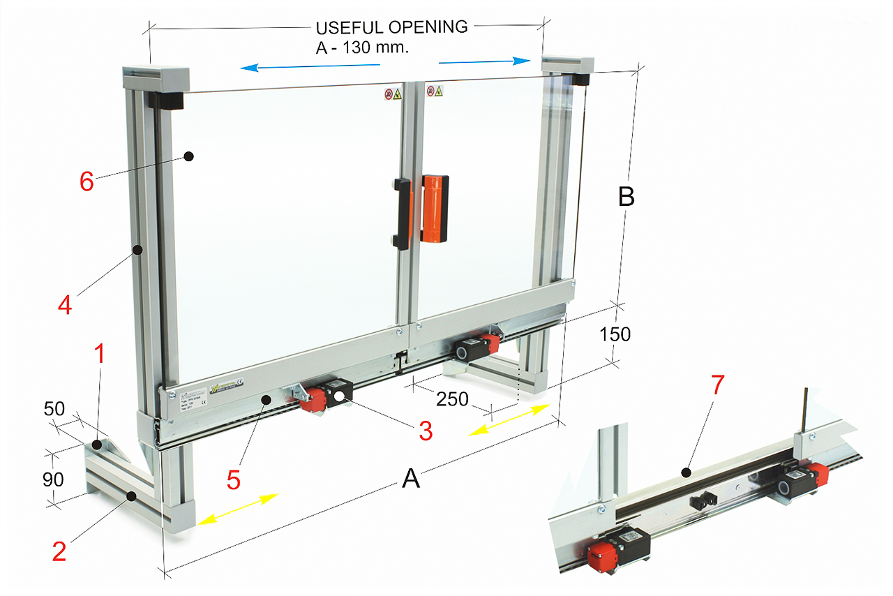 1 Winkelhalter aus Stahlblech2 Vielfach einstellbare Konstruktion mit zwei unterschiedlichen Befestigungssystemen3 Sicherheits-Mikroschalter mit eigenem Auslöser und 2 Öffnungskontakten4 Rahmen aus Aluminiumprofil5 Kugelführungen mit einer Weglänge, welche der Baulänge entspricht6 Schutzschirm aus schlagfestem und ölbeständigem dickem Kunststoffmaterial7 Nach innen geneigter Aufbau für besseren Kühlflüssigkeitsablauf Produktbilder: (Abbildungen zeigen ggf. Zubehör und Sonderausstattung. Bei Unklarheiten helfen wir Ihnen gerne weiter.)