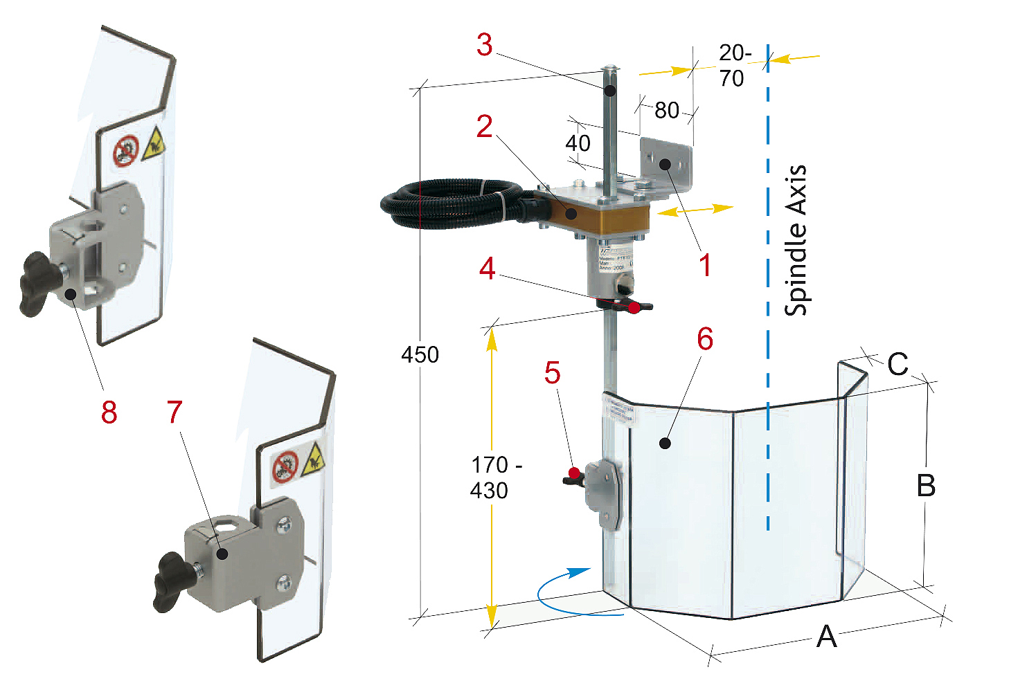 Der Schutzschirm kann vertikal eingestellt werden: Die Baugruppe Schutzschild-Tragarm ist mit Hilfe der Mikroschaltergruppe (4) einstellbar. Der Schutzschirm kann mit Hilfe des Arms (5) eingestellt werden. Der Klemmhalter für das Schutzglas kann wahlweise nach innen (7) oder nach außen (8) befestigt werden und ermöglicht dadurch einenhorizontalen Einstellbereich
