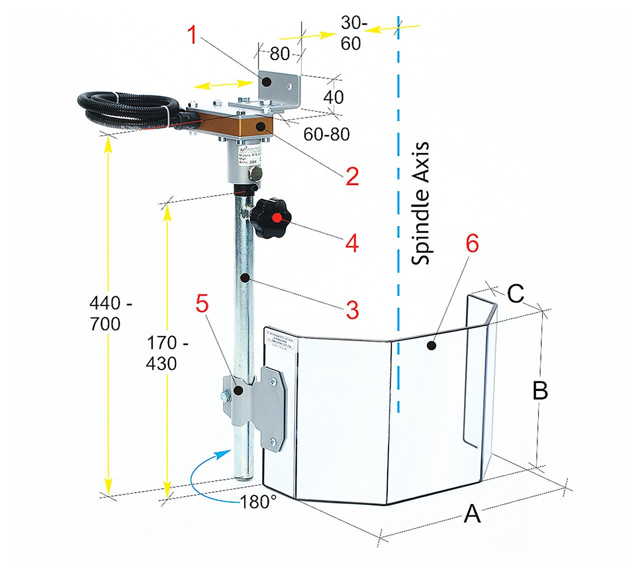 1 Winkelhalter aus Stahlblech2 Sicherheits-Mikroschalter-Gehäuse, 180° drehbar, 2 Öffnungskontakte3 Teleskoparm für den Schutzschirm4 Klemmschraube für die vertikale Einstellung des Schutzschirms5 Klemmhalter für den Schutzschirm6 Vorderer Schutzschirm aus Polykarbonat Produktbilder: (Abbildungen zeigen ggf. Zubehör und Sonderausstattung. Bei Unklarheiten helfen wir Ihnen gerne weiter.)