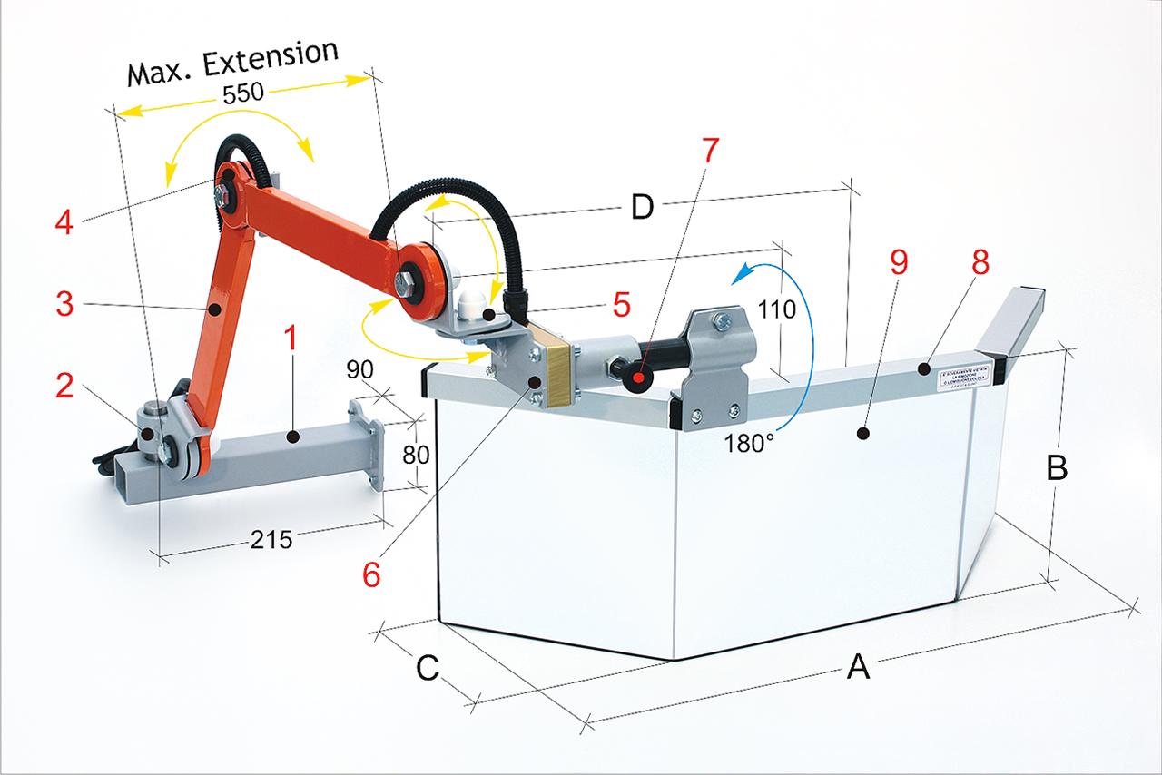Universelle Schutzeinrichtung mit Gelenkarmen, optimal geeignet für häufig wechselnde Arbeiten.Praktisch und einfach zu handhaben