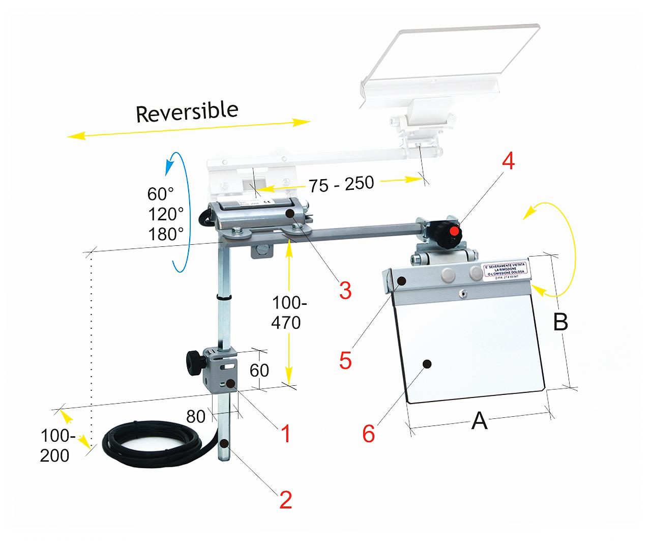1 Winkelhalter aus Stahlblech2 Einstellbare Tragarme aus Sechskantstahl3 Schutzschildgruppen-Kippscharnier enthält den Sicherheits-Mikroschalter mit 2 Öffnungskontakten4 Gelenksklemme für horizontale und vertikale Einstellung des Schutzschirms5 Schutzschirmhalterahmen aus Aluminiumprofil6 Schutzschirm aus schlagfestem Kunststoffmaterial Produktbilder: (Abbildungen zeigen ggf. Zubehör und Sonderausstattung. Bei Unklarheiten helfen wir Ihnen gerne weiter.)