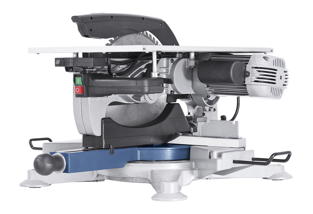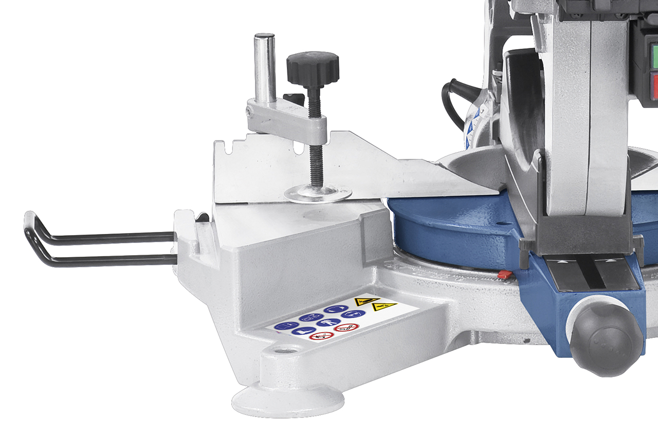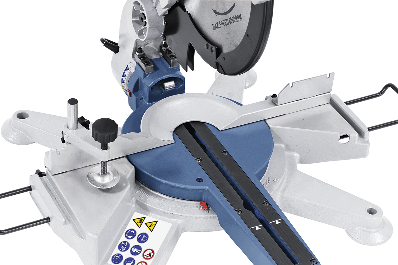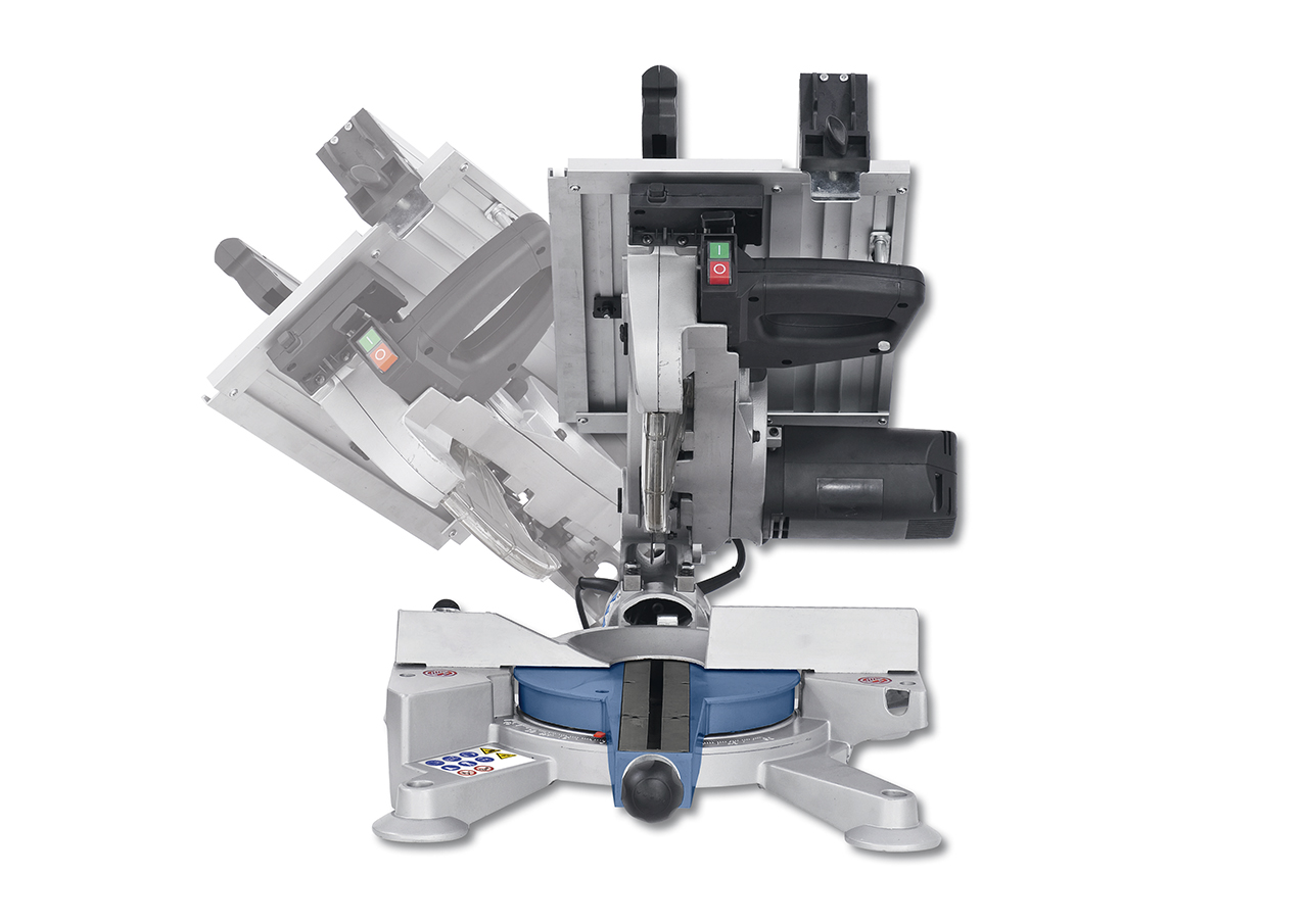 - Doppelgehrungsschnitte bis 45 ° links möglich, durch neigbaren Sägekopf und schwenkbarem Drehteller