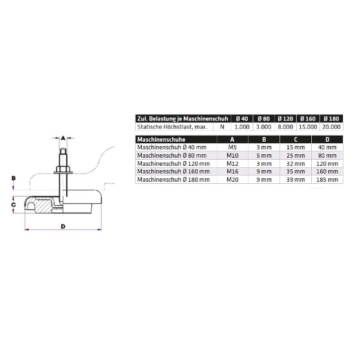 Max. Belastung je Maschinenschuh:- Drehmaschine: 1.600 kg- Fräsmaschine: 2.000 kg- Flachschleifmaschine: 1.600 kg- Maschine allgemein: 4.000 kg- Statistische Höchstlast, max. 6.000 kg- Gewindebolzen-Nivellierung, max.: 12 mm