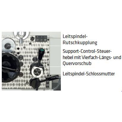 Interessante Besonderheiten stellen die an den Werkzeugschlitten angebauten R/L-Steuereinheiten dar, durch die auf einfache Weise der Rechts- oder Linkslauf der Drehspindel angesteuert wird. Sie ersetzen die bei Universaldrehmaschinen üblichen Schaltwellen.