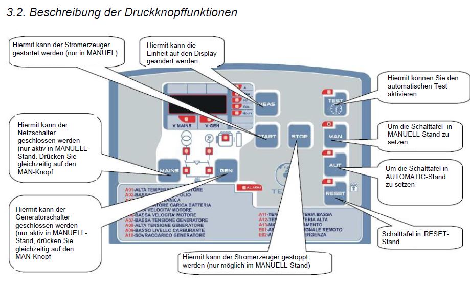 Alle betriebswichtigen Systeme des Stromerzeugers werden laufend überwacht. Bei Auftreten eines Fehlers wird am Display der Automatiksteuerung ein Alarmcode angezeigt. Änderungen der Steuerungsparameter und von Alarmfunktionen zur Anpassung an spezielle Betriebsbedingungen sind auf passwortgeschützter Menüebene möglich.
