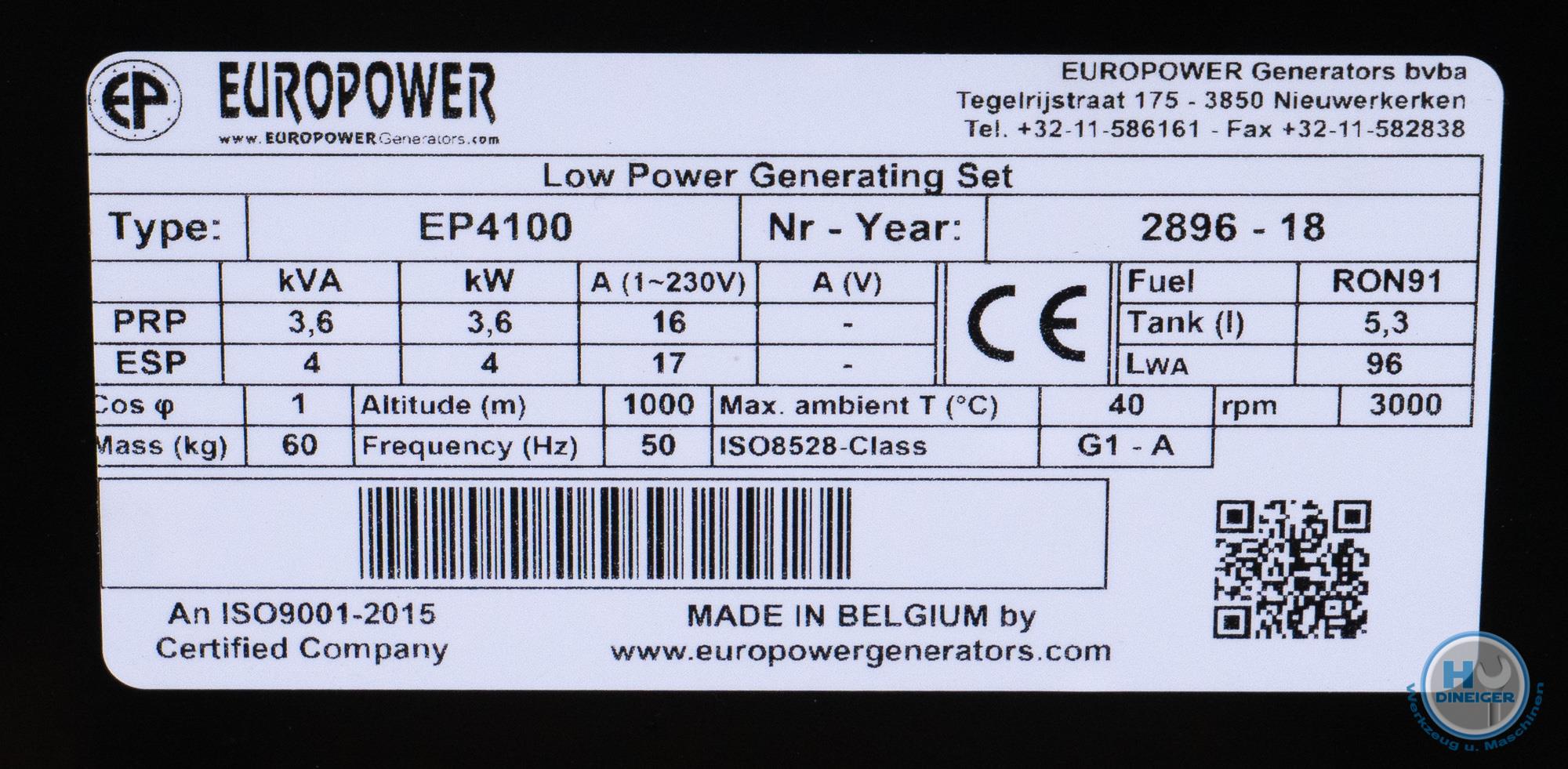 Europower EP4100 Standard-Stromerzeuger mit luftgekühltem Motor, 3000UpM, 50Hz, 4-Takt