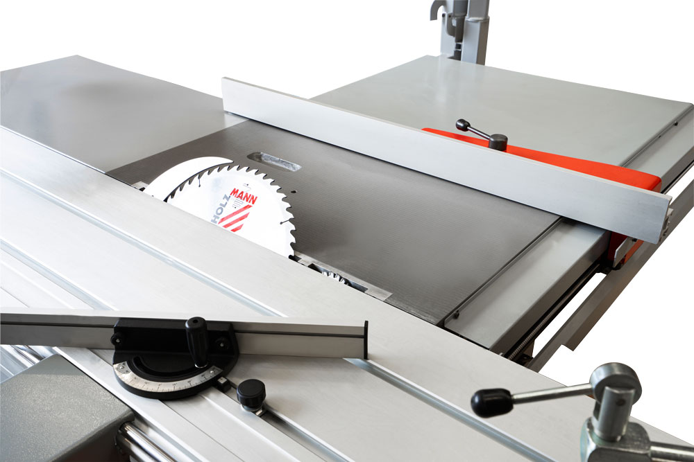 Die HOLZMANN Formatkreissäge FKS400VF32Gold_400 hat neben einer am Display zu verstellenden Sägeblatthöheneinstellung bzw. Sägeblattschwenkung (90-45°) auch einen Parallelanschlag mit Positionierung über Umlaufspindel und Servomotor. Der leichtgängige und große Schiebetisch sowie der passende große Auslegertisch ermöglichen einfache und präzise Plattenzuschnitte. Die Bedienung erfolgt wahlweise am Display oder das Ein -Ausschalten der Sägeaggregate auch mittels konventionellem Ein-Aus-Schalter (an 2 Stellen an der Maschine).