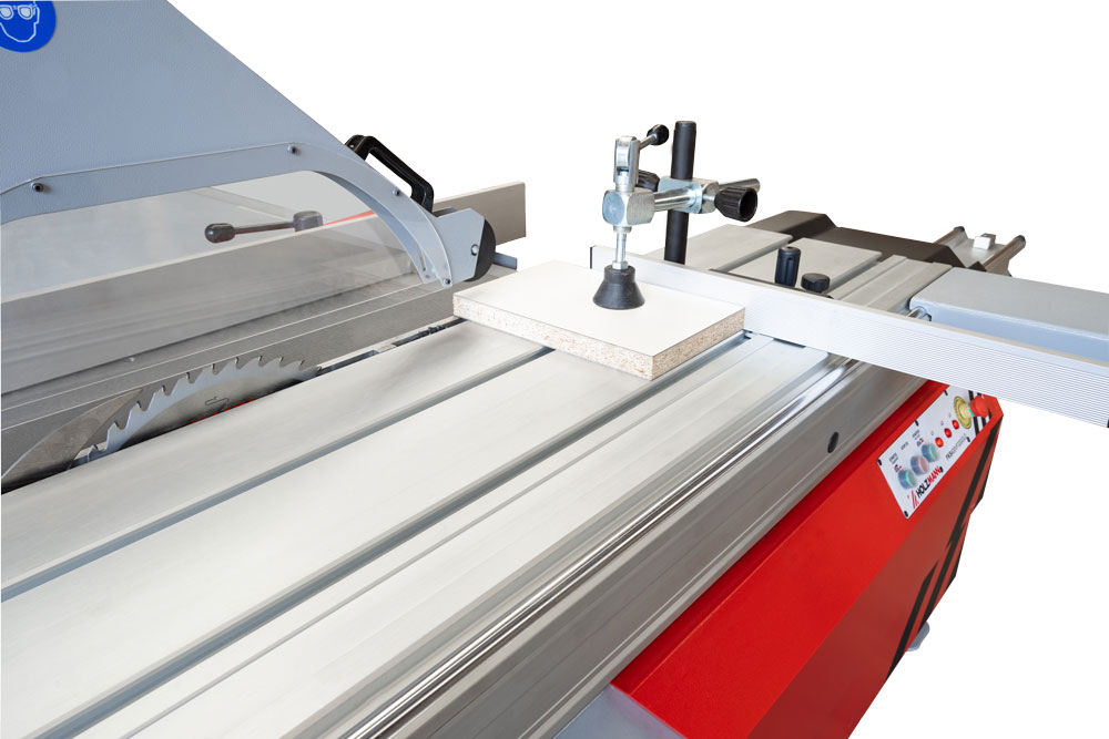- mit großem Alu-Schiebetisch und Ausleger ideal für die Bearbeitung großer Werkstücke, sowie das Zuschneiden von großen, schweren Platten
