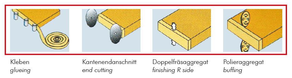 Automatisches und präzises Ankleben der Kante, mit integrierter Doppelfräsung oben und unten sowie ein passgenauer Kantenabschnitt mittels integrierter Schneideeinheit und Polieraggregat in einem Arbeitsgang.