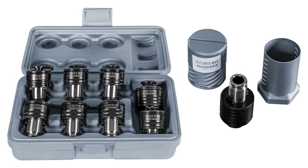 Lieferumfang: inkl. Spannzangenset (DIN371:M3,M5,M5,M6,M8,M10; DIN376: M12,M14,M16)